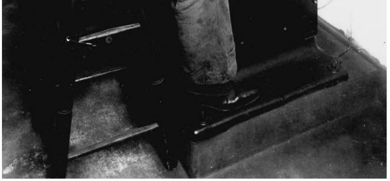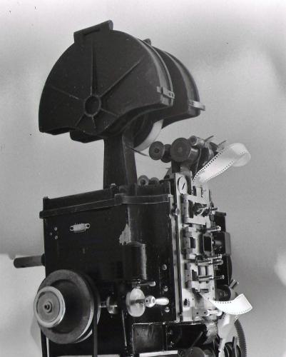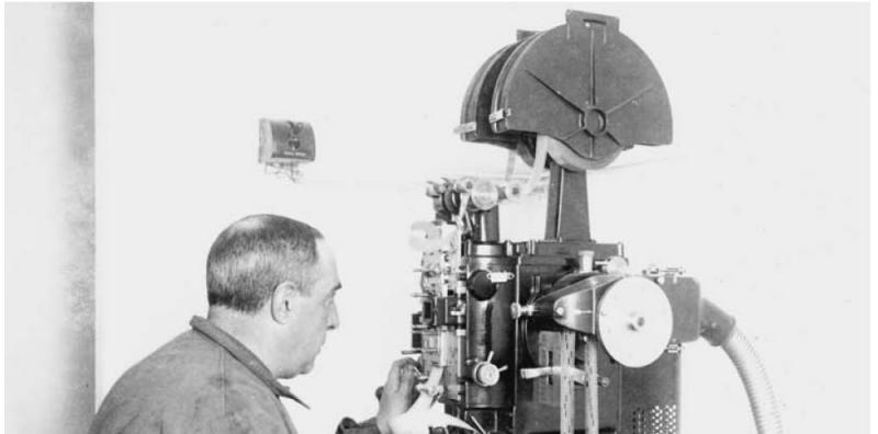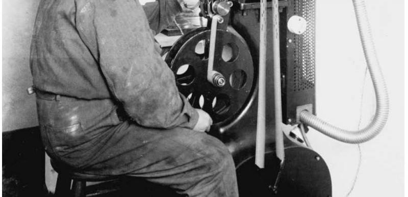 Am Abend des 6. September 2000 habe ich einen Drehstrommotor mit einem Frequenzwandler zusammen installiert und die Matipo mit der Nummer 322 ist nach vielen Jahren eines traurigen Daseins an der Bahnstraße 21 in Bern in meinem Betrieb in Basel wieder in Bewegung gekommen. Rostlöser, Öl und noch ein Mal Öl, putzen, einstellen . . . Meine erste Kopie hatte ich am 8. September auf Eastman 5302 fertig. Sprungschrammen im Negativ, Träger, Tonspur, und Kratzer im Positiv, Träger, Tonspur. Die Anstände waren bald behoben. Ich habe nicht den vollständigen Apparat, der Sockel fehlt. Nr. 322 ist noch als Fragment ihres ursprünglichen Zustands erhalten, nämlich der Kopf mit den Filmhaltern und mit dem mechanischen Teil der Lichtersteuerung. Diese Ruine kaufte ich Jahre zuvor Walter Ritschard für 400 Franken ab. An jenem Nachmittag ahnte ich nur, daß da eine Matipo ein örtliches Schicksal erlitten hatte. Später, beim Nachdenken über die Berner Filmtechnikszene, fiel mir das Buch von Milton Ray Hartmann ein, sein „Lebenswerk“. Zwischen den Zeilen dieses Buches lese ich von den Wechselfällen, denen meine Matipo vermutlich ausgesetzt gewesen war. Nichtsdestotrotz funktioniert Nummer 322 einwandfrei. Nach einigen wenigen Handgriffen, die ich während meiner Anstellung bei der Zürcher Cinégram 1987-88 an einer Bell & Howell C machte, setzte ich mich also vor über 12 Jahren zum ersten Mal mit der Französin auseinander. Das läßt sich so beschreiben: Wie bei den meisten Kopierapparaten aus der ersten Blütezeit des Stummfilms, Lumière, Stineman, Ernemann, Bamberg, Vinten, Prévost, sitzt der Kopist mit Blick aufs Kopierfenster frontal davor. Dieses ist mit einer rot gefärbten Glasscheibe ausgestattet, durch die hindurch der Vorgang beobachtet werden kann. Das ist auch nötig, denn für brauchbare Kopie sind fehlerlos brennende Lampe und perfekter Transport der Filmstreifen erforderlich, die man überwachen muß. Beim Anlaufenlassen hat der Kopist die letzte Möglichkeit, einen Versatz zu entdecken und anzuhalten. Alles, was beim Kopieren als unbrauchbar weggenommen werden kann, braucht nicht entwickelt zu werden. Beim Kopieren wird am leichtesten Ausschuß produziert und auch am schnellsten. Auf dem Bild ist der Moment kurz vor dem Anlauf festgehalten. Der Operateur hält mit der linken Hand den Kupplungshebel, den er um 90 Grad nach links außen dreht, um alles in Gang zu setzen, und mit der rechten Hand bremst er sachte die mit den Wickelkernen verbundenen Flansche, weil die Maschine gerne den Film vom Kern abreißt. Die Aufwickelfriktionen können nämlich nur schwer so eingestellt werden, daß sie dem Film am Anfang und nach 300 Metern gerecht werden. Zu schlaff gewickeltes Material ist ebenso unerwünscht wie beschädigte Perforation in den innersten Windungen. Einzige Abhilfe leisten größere Wickelkerne, die Debrie aber nie angeboten hat. Die Matipo hat einen Kurbeltrieb, der dem Greiferrahmen eine gleichmäßige Aufabbewegung erteilt. Eine zweite Scheibe versetzt den Doppelgreifer in der Tiefe und eine dritte Kurvenscheibe führt einen Rollenarm, an dem der Andrückrahmen des Filmkanals eingehängt ist. Im Zusammenspiel zieht der Greifer die Filme um einen Schritt nach unten, gefolgt vom Andruck des mit einem Glasklotz und der Rotscheibe besetzten Rahmens, wonach der Greifer nach oben läuft, der Verschluß Licht freigibt und wieder verdeckt, bis fast gleichzeitig Greifereinstich und Abhebung des Druckrahmens vor sich gehen. Die Scheiben können einzeln gegenüber der Kurbel verstellt befestigt werden. Auch der Verschluß kann um etwa 20 Grad in beide Richtungen verdreht montiert sein, abgesehen von der zwischen 75 und 120 Grad verstellbaren Öffnung. Eine kreisrunde Öffnung im Verschlußblech, abgedeckt mit einem Stück roter Folie, hilft beim Einspannen der Filme. Der Kopist dreht am Handrad auf dieses Rotfenster, wobei der Greifer voll im Zug steht. Er legt den Negativvorspann mit Bildstrich auf Fenstermitte, den Rohfilm darauf, schließt die Filmbahn (Schnapper) und hakt den Andrücker an der Mitnahmegabel ein (Rückzug). Wenn er es richtig gemacht hat, steht das Bild Ende Zug jeweils vor dem Fenster. Die Machine à tirer les positifs, Matipo, klappert gerne mit 12 bis 14 Bildern pro Sekunde. Schneller ist möglich, führt aber zu verstärktem Verschleiß. Der Apparat braucht schon genug Öl, das man über sieben einzelne Leitungen einbringt. Heikelste Stelle ist das Schraubengetriebe im Innersten der Boîte. Wie es dazu gekommen war als Verbindung der Antrieb- und der Abtriebwelle, ist mir bis heute unklar. Es wäre auch ein kegliges Getriebe möglich gewesen, das bedeutend günstiger herzustellen ist und einen größeren Wirkungsgrad hat. Nun noch ein Mal ein Blick auf das Bild! Hinter dem Lochblech an der Maschinenrückseite befindet sich eine Widerstandssäule auf Keramikkörper. Zwanzig Abgriffe liefern abgestufte Lampenspannungen, zwischen denen über Relais umgeschaltet wird, je nach der Lochung im untersetzt mitlaufenden Steuerstreifen, den wir rechts vorne sehen. In die Lochungen fallen Tasthebel von Mikroschaltern, die jeweilen einen Lampenkreis ansteuern. Damit bei einem bestimmten Tempo genau während des Filmtransports von einer Szene zur nächsten umgeschaltet wird, werden in ebenfalls genau bestimmtem Abstand von der Klebestelle Kerben aus dem Negativrand gestanzt. Ein weiterer Mikroschalter mit Rolle auf der Filmkante wird von den Kerben betätigt, worauf eine vorgespannte Hebeleinrichtung, man sieht zwei Handhebel aus ihrer Rechtecköffnung stehen, ausgelöst wird. Zusammen mit dem Lochstreifen ist die Codierung für die Lampe gegeben. Das Doppelhandrad mit zusätzlichen Griffhebelchen rechts von der Filmbahn dient der Verstellung der ganzen Filmbahn dem Greiferantrieb gegenüber — vertikale Einmittung des Bildes — und Verstellung des Bildfensters innerhalb der Filmbahn zum Abfangen der leichten Versätze aus den unterschiedlichen Kameras. Hier