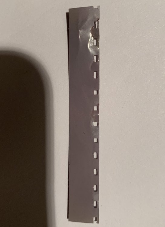 Noch mal kurz zu Kahl... ich hab hier am Wochenende mal eine Rolle DS8-Film von Kahl in meine Bolex H8DS8 gelegt um die Empfindlichkeit einzutesten... nach wenigen Metern und einigen "Todesschreien" der Bolex riss er dann. Mein erster Filmriss ever in einer Bolex H. Also hab ich aufgegeben, den Film entnommen und zum Testen meines neuen Filmtrenners geopfert. Hier mal ein Schnipsel davon nach dem Trennen. Man achte auf die Perfo. Und nein, das war nicht die Kamera, es gibt einige solche "Langloch"-Stellen auch auf dem Teil, der es nicht mehr über die Zahntrommeln geschafft hat. -