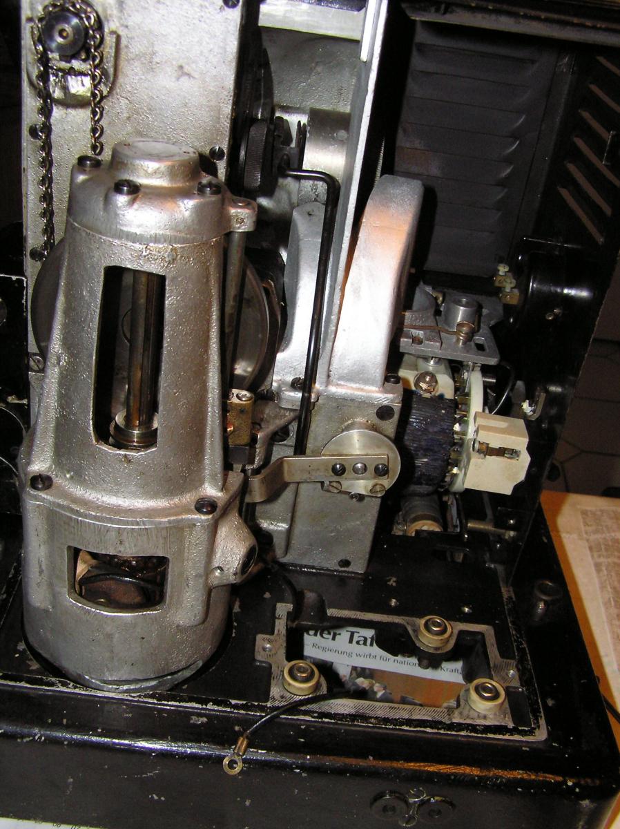 Rückseite. Lampenhaus wieder eingebaut. Im Lampenhaus war früher die bekannte Projektionslampe mit Bajonettfassung. Sie wurde durch 250 Watt 24 Volt Halogen Stiftsockellampe ersetzt.