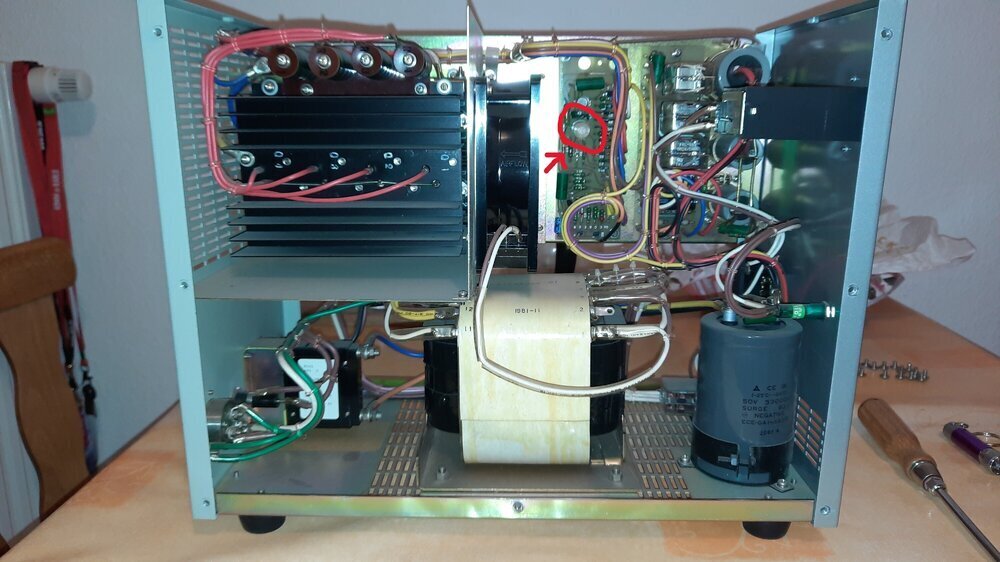 Der rot markierte Trimmer ist der einzige Einstellregler im Netzteil. Damit lässt sich der Lampenstrom im Bereich von 23 bis 27 A einstellen. Der Regler ist ein Cermet-Typ. Man muss allerdings deutlich daran drehen, damit beim Lampenstrom überhaupt etwas passiert. Ein Amperemeter im Lampenstromweg habe ich extra nachgerüstet.