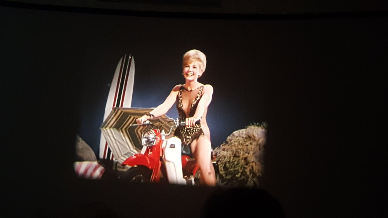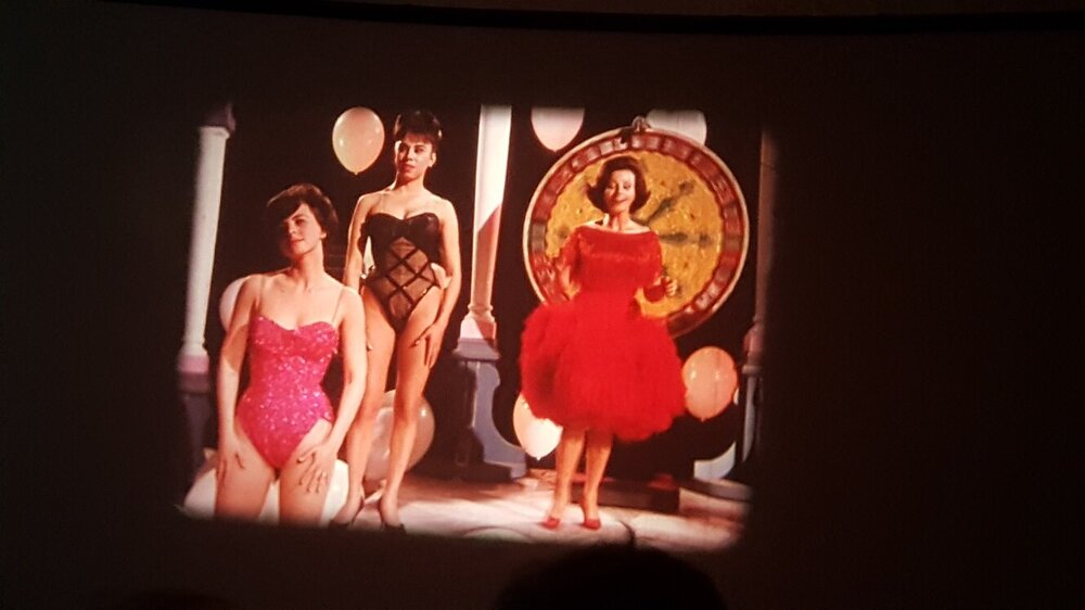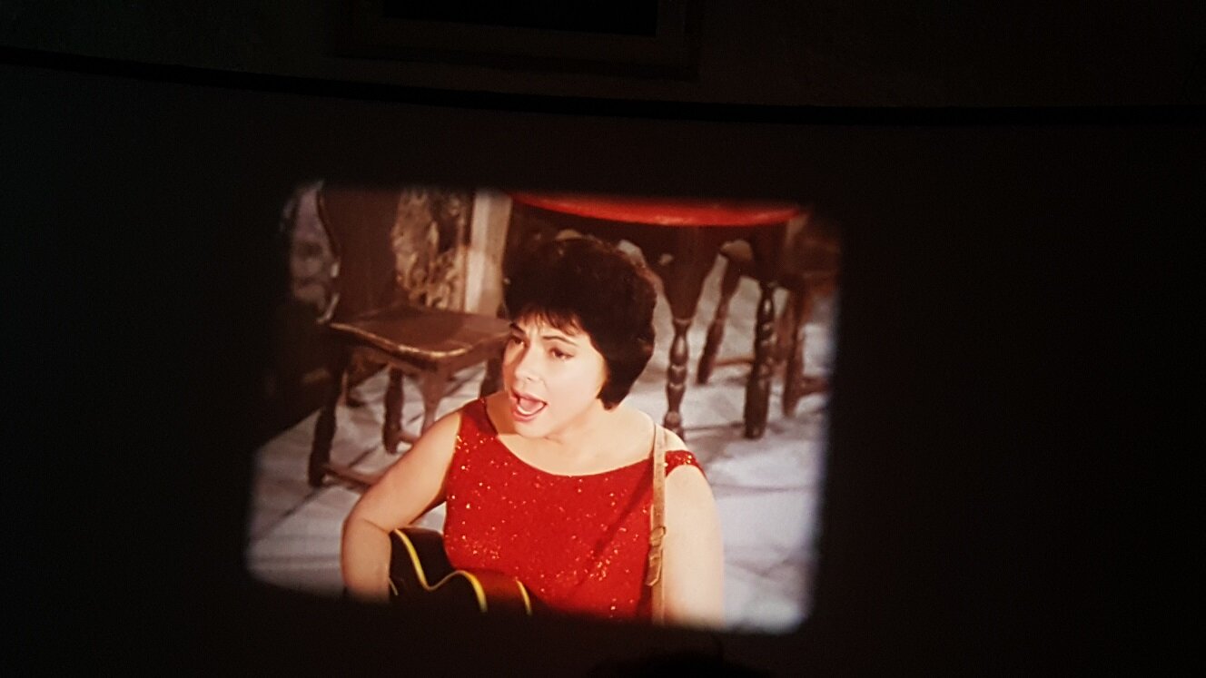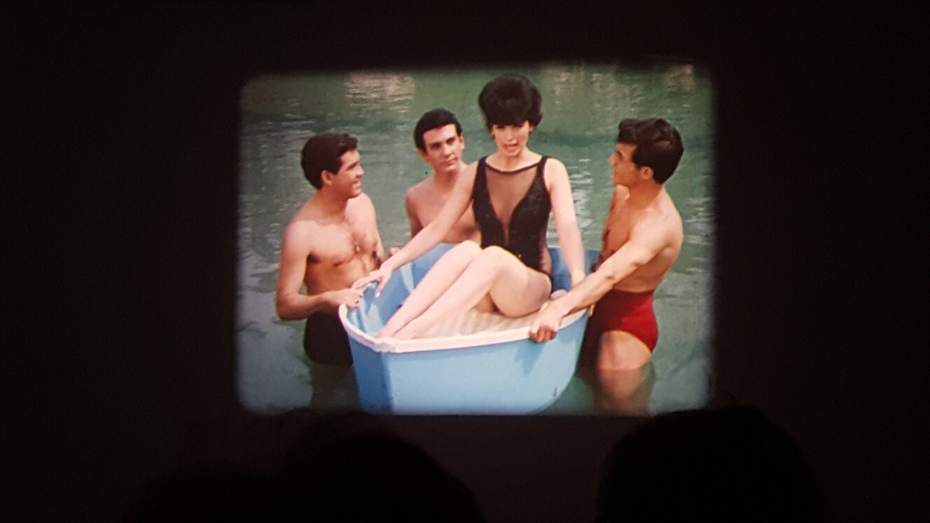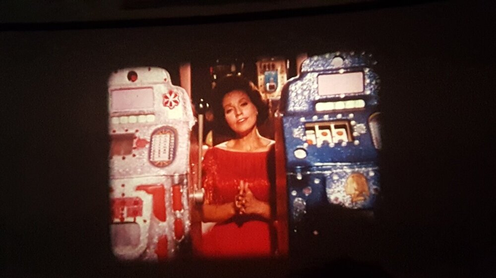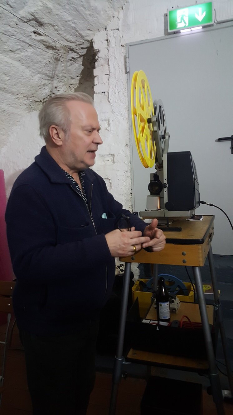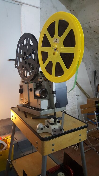 Ich möchte noch einen kleinen Bericht über die beiden Scopitone-Abende nachreichen. Für einen ausformulierten filmkorn-Beitrag reicht es gerade zeitlich nicht (und ich möchte auch nicht Friedemanns tollen Artikel über die Dresdner Schmalfilmtage gleich wieder von der "pool position" verdrängen...) Ich war stärker in die beiden Abende involviert als ursprünglich gedacht - denn ich musste kurzfristig mit einem Projektor aushelfen. Der Bauer P8T400 aus dem Bestand des Arbeitskreis Film / Kurzfilmwoche wusste tonmässig nicht zu überzeugen. Ich konnte mit einem Bauer P8 Professional und einem Bauer P8 Selecton dienen - wobei der zuerst präferierte "normale" P8 tonmässig auch nicht optimal war: Der Ton klang ähnlich wie beim T400 irgendwie verzerrt und noch dazu rastete der Magnetton-Umschalter nicht ein ! (Weiß jemand woran die schlechte Tonqualität liegen kann ?) So kam der Bauer P8 Selecton zum Einsatz, den ich vor einigen Jahren bei @TK-Chris in Deidesheim erstanden habe. Aufgrund der etwas speziellen Bedienung, die dieser Projektor erfordert, war er nicht meine erste Wahl für diesen Abend - aber ich stand dem Projektionisten zur Seite (bzw. habe irgendwann im Laufe des 2ten Abends den Job komplett übernommen). Der Selecton verrichtete an beiden Abenden mit jeweils 2 großen 600m-Spulen hintereinander seinen Dienst hervorragend. Es gab ein paar Filme die scheinbar aufgrund schlechter Perfo zu Schlaufen-Verlust führten - den Selecton kurz in den Rückwärtsgang gefahren (mit der für Unwissende typischen "Schrecksekunde" bevor der Servo-Motor anspringt) und dann wieder in Vorwärtslauf, dann hatte der Film sich "wieder gefangen". Und endlich war einmal Gelegenheit, die Magnetton-Funktion und -Qualität zu prüfen - denn die Scopitones waren alle mit Magnetton ! Der Mono-Magnetton wurde über den Lautsprecher-Ausgang an einen Verstärker einer (sehr einfachen) Stereo-Kompaktanlage ausgegeben, wobei der Monoton über eine Weiche auf beide Boxen aufgeteilt wurde. Der Projektor-Verstärker musste zwar auf volle Lautstärke gestellt werden (der im Projektor eingebaute Lautsprecher wurde ausgeschaltet), aber der Ton war für ca. 60 Jahre alte Filme hervorragend, wie man ein bisschen im Clip am Ende hören kann. Am ersten Abend: Ca. 30 Zuschauer - der kleine Gewölbekeller in der Regensburger Altstadt war fast voll. Rolle 1 mit zumeist französischen, aber auch ein paar deutschen Stücken - leider alle mehr oder weniger rotstichig. Rolle 2 mit US-amerikanischen Produktionen in hervorragender Farbqualität, wie die Fotos zeigen. Bernd Brehmer sprach von "Technicolor-Kopien"...ich nehme an, das werden sie wohl nicht gewesen sein - aber Kopien auf farbstabilem Material. Bernd Brehmer vom Werkstattkino München Aus seiner Sammlung stammten die Scopitones Hier Beispiele für die schönen Farben der Rolle 2: Am zweiten Abend : etwas weniger Zuschauer (aber für einen undankbaren Montagabend ok) - z.T. die gleichen Leute wie abends zuvor Rolle 3 mit eher kuriosen Produktionen aus verschiedenen europäischen Ländern (Spanien, Türkei, Israel....) Rolle 4 war als "Outtake-Rolle" angekündigt - hatte aber Trash-Qualität. Hier ein Mitschnitt einer Insta-Storie. Die schlechte Bildqualität bitte entschuldigen. Man sieht aber gut den mehr oder weniger vorhandenen Rotstich.2 Punkte