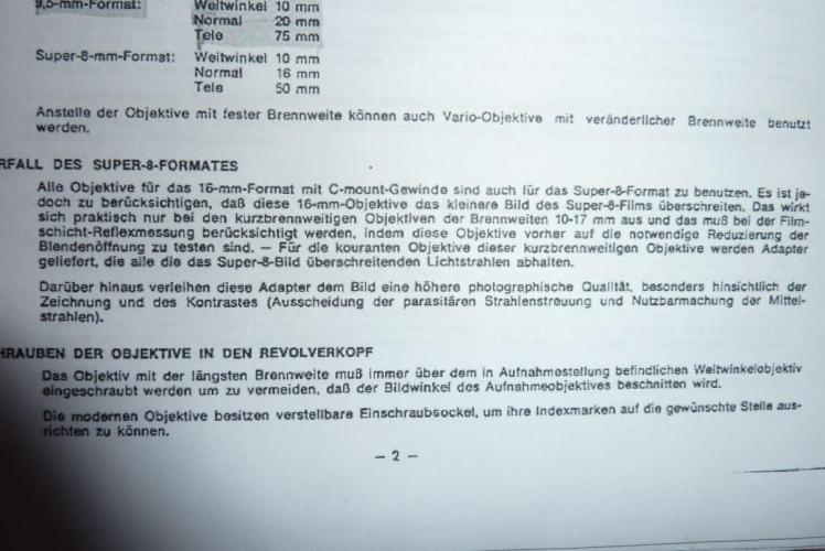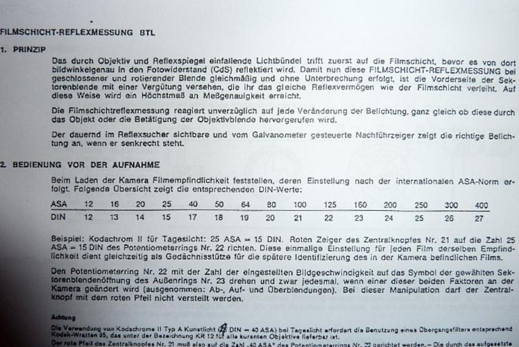 Ist schon interessant, und sie tut es wirklich. An anderer Stelle schwelgt die BDA förmlich in dieser "hi-tec" Methode. Siehe angehängte Dateien, (Sorry für die Qualität, hatte leider keinen Scanner zur Hand) Pathe scheint jedenfalls der Meinung gewesen zu sein, dass die Reflektionseigenschaften aller Emulsionen identisch wären, vieleicht war das 1960 so. Na ja! Im paraktische Betrieb kann ich allerdings sagen, klappt das. Grau ist alle Theorie und Belichtungsspielraum gleicht vieles aus. Warum haben die das so gelöst? Ich kann mir nur vorstellen, dass der Grund war, auf diese Weise eine weitere Ausspiegelung zu vermeiden. Allerdings ist bei Objektiven mit größerem Bildkreis bei der DS8 Pathe die Gefahr von verfälschendem "Reflexionslicht" schon durchaus einzusehen. Pathe schreib ja auch von "Adaptern", die den Strahlengang dann korrekt abschatten. Einen solchen Adapter habe ich allerdings nie gesehen, und er scheint mir auch höchst merkwürdig! Zwischen Hinterlinse und dem vielgeschmähten "Gläschen" (Sucherauskoppelung) ist nämlich so gut wie kein Platz. Da möchte ich nichts hinbringen müssen. Generell ist die ganze optische Gestaltung der Pathe schon etwas für Liebhaber des Filigranen.2 Punkte