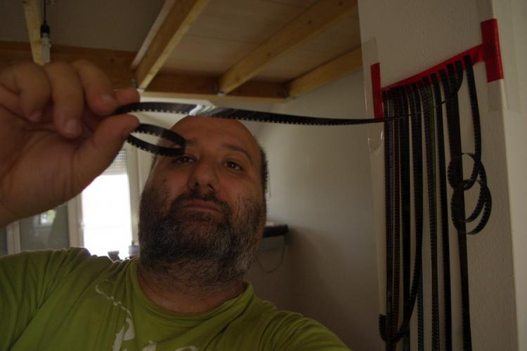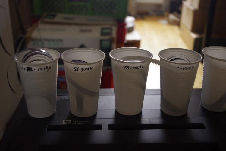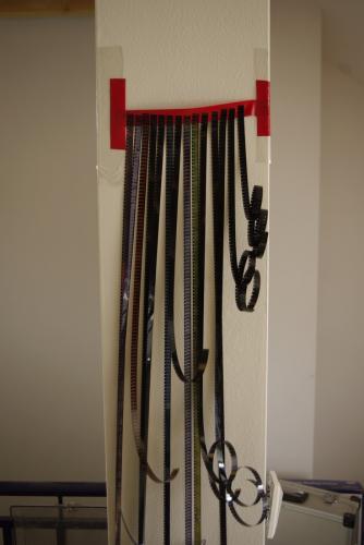 1. Ich würds in meinem Fall nicht gleich "basteln" nennen, aber beim Schneiden der letzten Kassetten (zwei davon ausnahmslos mit animierten Zwischentiteln) brauchte ich auf die Schnelle eine Sortierhilfe. Das rote, 2 cm breite Klebeband ist aus dem Baumarkt und hat eine sehr geringe Klebwirkung; nicht größer als die Klebwirkung von mehrmals verschließbaren Taschentuchpackungen o.Ä. Ideal zum *Anpinnen* und rückstandsfreien Wiederablösen von Filmstreifen. Mit Tesa kurz mal an den Putz geklebt. Ging natürlich auch wieder rückstandsfrei ab (vorher ausprobiert). In beschrifteten Einweggetränkebechern werden die Filmreste gesammelt - bis zur Vernichtung oder Wiederverwendung (Vorspänne, Schwarzfilm, Blankfilm, Unscharfe, Verwackelte, Über-/Unterbelichtete) getrennt nach Filmkassetten. Hab mir angewöhnt, für meine bessere Übersicht über alle Kassetten Buch zu führen (fortlaufende Nummer) und die Kassetten noch vor dem eigentlichen Verfilmen mit Buchstaben zu belichten. Dann trägt jede Filmportion so einen Anfang: Dazu hab ich mir mal so ein DIN A4 Heft gemacht... in welchem alle Buchstaben in der Reihenfolge, in der sie vorkommen, drin sind (ein Buchstabe pro Seite) und ich brauche nur am Anfang der Kassette (oder wenns mal schnell gehen muss, dann halt mal ohne und erst in der Mitte oder am Ende der Kassette) Seite für Seite mit der Einzelbildschaltung abfotografieren. Voila. Fertig ist der Vorspann. Weiterer Vorteil: sollte im Labor mal was durcheinander kommen... kann der Film wieder zugeordnet werden. (Im Laufbidlsektor hatte ich zwar noch nie Probleme, aber in der Standbildfotografie ist im Abstand von einigen Jahren schon so einiges passiert; meine Abzüge plus fremde Negative, dafür fehlten die Negative von mir, oder Auftrag komplett verschwunden und solche Sachen).