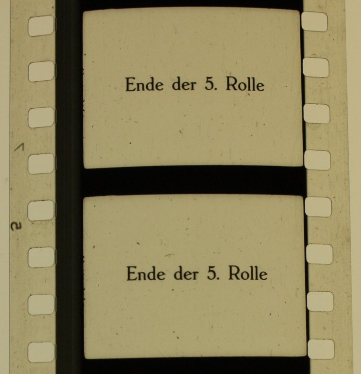 Liebes Forum, in meinem Fundus befindet sich ein einzelner sehr alter 35mm-Akt eines unbekannten Films auf Triazetat, sehr wahrscheinlich eine Kopie älteren Materials von vor 1945, wie sich durch Sujet, Photographie und Kostüme vermuten läßt. Leider hat der Akt, der ansonsten fast vollständig zu sein scheint, keinen Vorspann, er beginnt einfach mit einem durchgeschnittenen Bild wohl am Anfang einer Szene. Jetzt möchte ich den Akt (neben anderen restauratorischen Maßnahmen) gerne mit einem Vorspann versehen, um ihn für eine etwaige Vorführung bereit zu machen. Aber Vorspannmaterial auf Triazetat scheint mir recht rar zu sein. Meine Frage: Wäre es statthaft, an einem solchen Triazetat-Akt einen Polyester-Vorspann mittels Trockenklebepresse anzubringen? (Statthaft sowohl im konservatorischen Sinn wie auch in Bezug auf fachgerechte Vorführung.) Und im Zusammenhang mit diesem Akt stellt sich mir noch eine zweite Frage. Da waren noch mehrere lose kurze Fetzen von Resten mutmaßlicher Start- und Endbänder dabei, und bei einem davon befand sich zwischen zwei Abschnitten aus Schwarzfilm, der sich eindeutig als Triazetat identifiziert, ein etwa halbmeterlanger Abschnitt mit dem Titel „Ende der 5. Rolle“ (siehe angehangenes Foto) ohne solche Identifizierung. Man müßte also erstmal davon ausgehen, daß das Nitro ist. Oder? Daher die zweite Frage: War es ohne weiteres möglich, Triazetat und Nitro miteinander naß zu kleben? Die Klebestellen selber in dem fraglichen Fetzen sehen ungeachtet ihres hohen Alters sehr gut aus. Liebe Grüße Siegfried1 Punkt