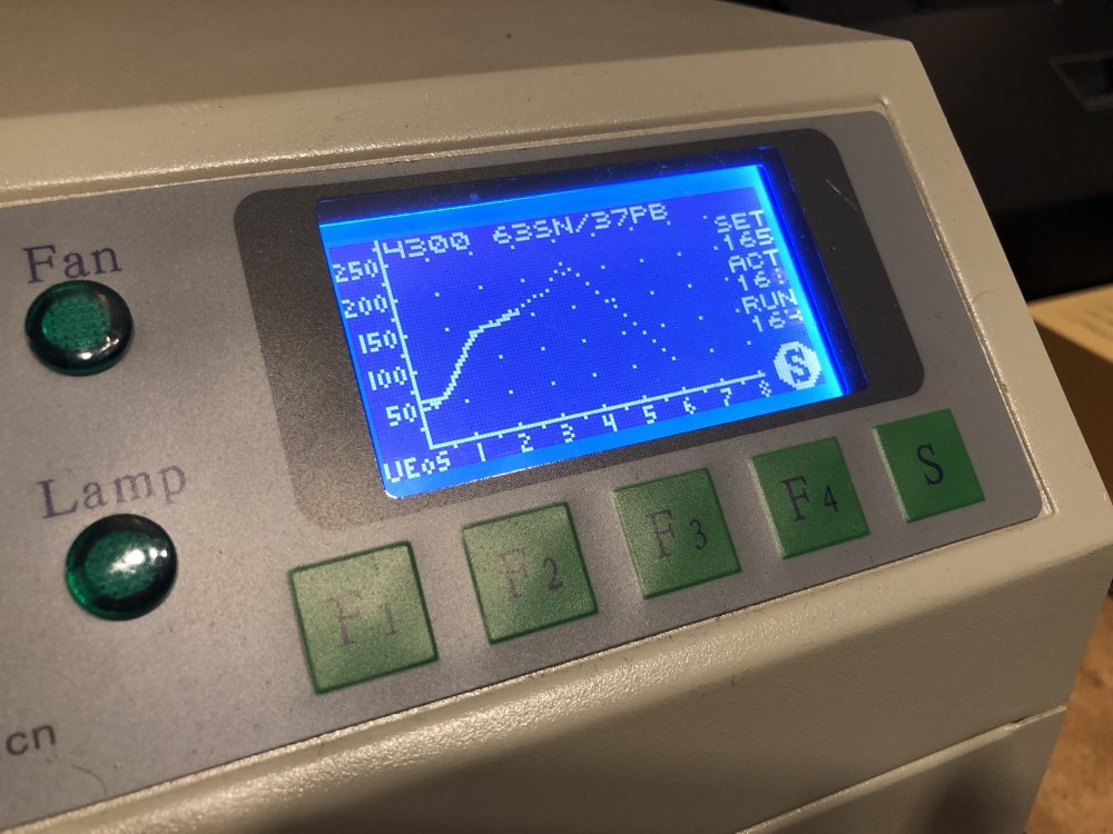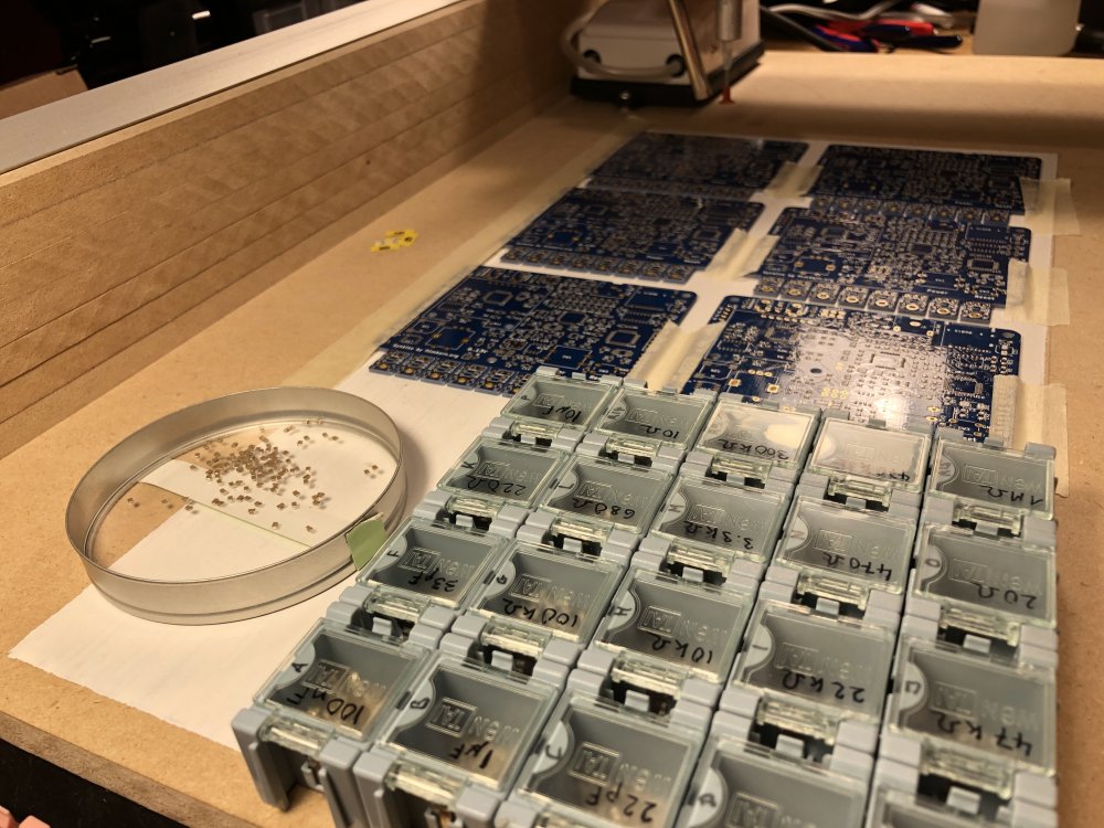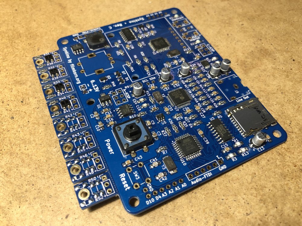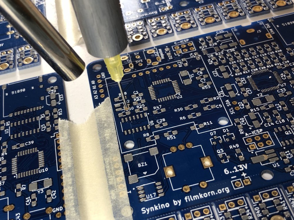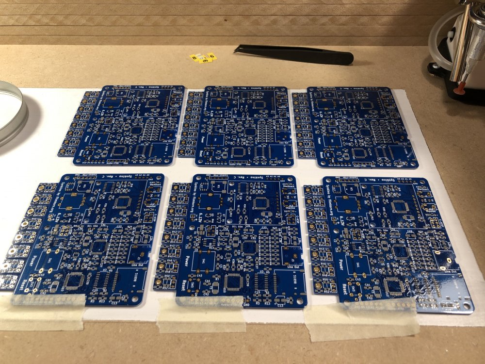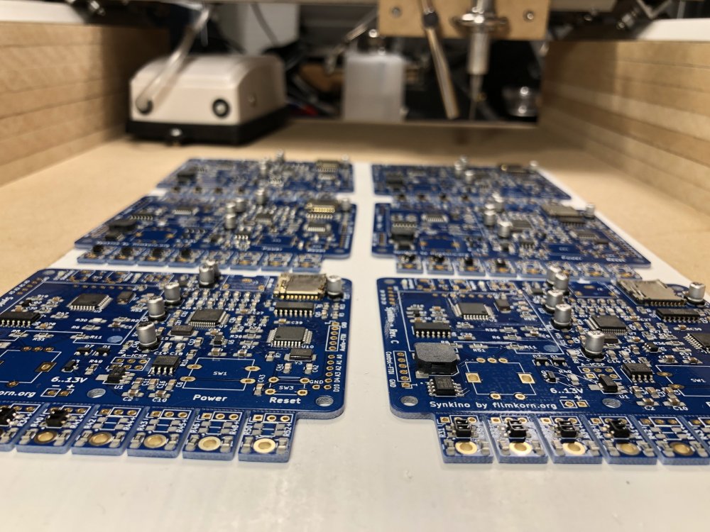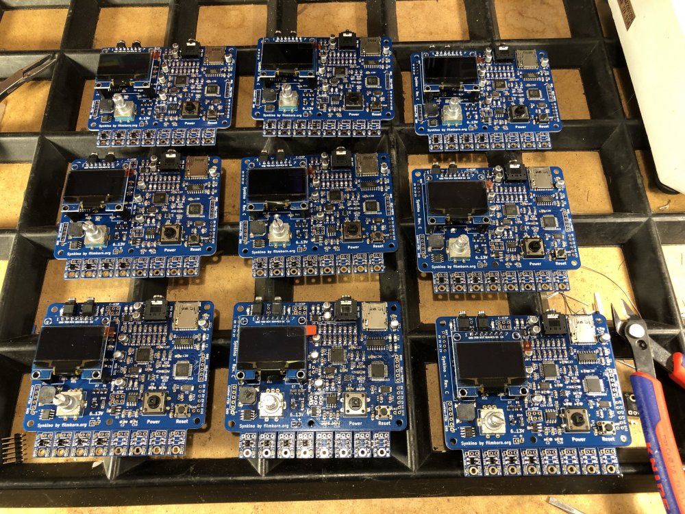9. Etwa 7 Minuten dauert das backen. Der Ofen hält nach den Modifikationen die Solltemperaturen meiner Kurve ganz hervorragend exakt ein: Et voilà! So sauber kriegt man es mit der Hand nicht ganz hin. Pro Platine hatte ich aber noch 5-6 Tombstones und andere Fehlerchen, die gefunden und mit der Hand korrigiert werden mussten. Das schlimmste war der DSP in der Mitte, mit den 48 Beinchen – den hatte ich bei zwei Platinen um ein Bein versetzt bestückt, das Auslöten und wieder einlöten dieses Käferchens ist kein Spaß. Hat aber geklappt. Zum Wegwerfen ist er zu teuer. Und das Tagwerk: Die ersten 9 "Serien"-Synkinos! Das Einlöten der THT-Teile (Encoder, Taster, Buchsen, Displaysockel etc.) hat auch noch mal eine ganze Weile gedauert. Beim nächsten Projekt werde ich wohl komplett auf SMD setzen, das hätte hier viel Zeit gespart. TL;DR: Es geht endlich wieder voran ?