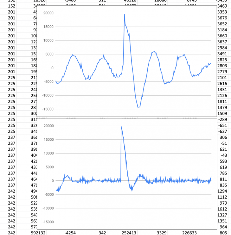 Nach langem Code anstarren, Tooling und ewigem Rumgerechne hat es eben laut Klick gemacht, und ich habe den Regler ganz massiv verbessern können. Das hat zwei Bedeutungen: Der bildgenaue Start ist deutlich zuverlässiger, unabhängig davon, wie die Datei encodiert wurde. Selbst mit kaputten Headern in den Dateien habe ich jetzt ausschliesslich Bildgenaue Starts. Die Synchronisation rastet viel schneller ein und schwingt so gut wie gar nicht mehr nach. Die Bitrate der Quelldatei spielt quasi keine Rolle mehr beim Reglerverhalten. EIne Angabe von P, I und D-Werten ist nicht mehr nötig. Ich bin daher sehr zuversichtlich, schon sehr bald eine Synkino-Software fertig zu haben, die nicht mehr so leicht enttäuscht wie die derzeitige. Hier mal ein visueller Vergleich; oben vorher, unten hinterher. Die y-Achse zeigt die Abweichung in Samples, 44100 Samples wären eine Sekunde Abweichung. 2450 Punkte sind ein EInzelbild Abweichung. Die x-Achse zeigt 50 Sekunden Filmwiedergabe, der "Zacken" ist ein Umschalten des Projektors für 5 Sekunden von 18 auf 24 fps. Während der alte Regler-Code recht lange nachschwang, rastet der neue Regler fast sofort wieder exakt ein, auch bei extremen Geschwindigkeitsschwankungen oder 100 Projektorstopps. Es wird. Und ich danke Euch für Eure Geduld...2 Punkte