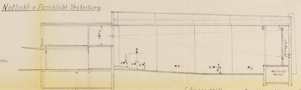 Mit unserem Saalboden (1957, Zweckbau, also keine nachträgliche Umnutzung) habe ich mich kürzlich bezüglich zweier Aspekte befassen müssen. Zum einen wurde bei uns eine Masterarbeit im Bereich Denkmalschutz/Dokumentation erarbeitet, dafür haben wir uns u.a. den Bodenaufbau und die Lage der Lüftungs-/Heizungsschächte unter dem Boden angeschaut. Zum anderen haben wir während der Schließung eine Grundreinigung und erneute Bodenschwärzung durchgeführt. Da der Saal recht groß ist, haben wir relativ viel Putzwasser eingebracht, und nach der Erstreinigung fiel mir auf, dass das Bodenprofil und die Ausarbeitung eines Bodenschachtes es zulässt, dass man größere Mengen Wischwasser dort versickern lassen kann. Ich glaube, dass das absichtlich so geplant war. Leider lebt der Erbauer nicht mehr, so dass sich das nicht mehr verifizieren lässt. In Zukunft ist eine großzügige Nassreinigung jedenfalls mit viel weniger Aufwand machbar, indem man einfach viel Wischwasser im hinteren erhöhten Bereich des Saales ausbringt, großzügig durchwischt, und dann nochmal ebenso großzügig mit Frischwasser nachspült. Dafür sollte man sogar nen Wasserschlauch nehmen können statt Putzeimern. Wir haben angesichts des Alters des Gebäude noch relativ viele Bauakten, aber das spezifische Bodenprofil wird darin nicht erwähnt, ich glaube es gibt auch keinen Profilschnitt in den Plänen. Fakt ist, der Saal fällt leicht ab (ca. 70cm auf etwa 16m Länge), wird dann im Bereich der vorderen 2-3 ursprünglichen Stuhlreihen horizontal, und steigt dann zur schmalen Bühne hin wieder leicht an (wenige cm). Auf der Höhe der vorderen Senke befindet sich seitlich links der erwähnte vergitterte Lüftungsschacht. In einer Tiefe von ca. 1m geht der Lüftungskanal dann ab nach hinten Richtung Heizung - der vertikale Teil ist aber noch tiefer nach unten ausgemauert (ca. 50cm), und unten liegen Kiesel und 60 Jahre Muttich drin. Auf der rechten Seite gibt es auch so einen Schacht, der endet aber auf der unteren Anschlusshöhe des Lüftungskanals und enthält keine solche 'Sickergrube'. Wir haben jedenfalls mit breiten Wasserschiebern sehr leicht das ganze überflüssige Wasser in den linken Schacht befördern können, und nach ner halben Stunde war das versickert. Der Boden besteht aus Gussasphalt. Im Bereich der Auflagen der seitlichen Lüftungsgitter kann man den Aufbau im Schnitt gut erkennen. 'Im Inneren des Schachtes kann man den Bodenaufbau erkennen. Der Gussasphalt ist ca. 1,7 cm stark und auf Holzlatten gegossen, darunter verläuft eine ca. 13 cm dicke Betonschicht und der Rest ist mit Ziegelsteinen gemauert.' Das mit Beton und Ziegelsteinen bezieht sich auf die Schachtwände, wie der weitere Unterbau des gesamten Bodens unter dem Gussasphalt gestaltet ist, wissen wir nicht. Ich glaube auch, dass der Boden im Querverlauf leicht konkav ist. Wäre aber möglich, dass das nach über 60 Jahren Nutzung auch einfach 'eingelaufen' ist. edit: Es gibt doch einen seitlichen Schnitt in den Plänen, weiss aber nicht, ob der bauverbindlich war, er entspricht jedenfalls auch nicht ganz der Realität im vorderen Bereich, und entstammt einem Plan, der eigentlich anderen Zwecken dient. Allerdings wurde das maßgebliche Gefälle von 70cm dort immerhin festgehalten. Man beachte die Einzeichnung der Profilansicht eines Ikovox Systems hinter der Leinwand (das auch tatsächlich dort verbaut wurde).1 Punkt