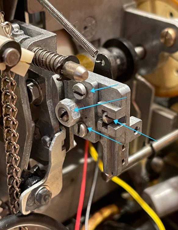 Siehe angehängtes Bild, Dein Greifer sollte ähnlich aussehen. An der Feder oben ist er aufgehängt und ein Exzenter auf der Motorwelle steuert seine Bewegung. Die vier markierten Schrauben verstellen den Greifer, Funktion jeder Schraube ergibt sich durch genaues Hinsehen. Tipps: Nie alle Schrauben gleichzeitig lösen/verstellen. Bildstrich vorher auf Mittelposition stellen. Der Bildstrich muss nach Abgleich komplette verstellbar sein, ohne dass der Greifer laut wird (anschlägt). Der Greifer sollte möglichst horizontal mittig in das Perfoloch greifen. Er muss tief genug eintauchen, aber auch beim Rückschritt ganz aus dem Film wieder herauskommen. Wenn DU den Objektivträger runterklappst, kannst Du den Greifer recht gut sehen. Hab Geduld.