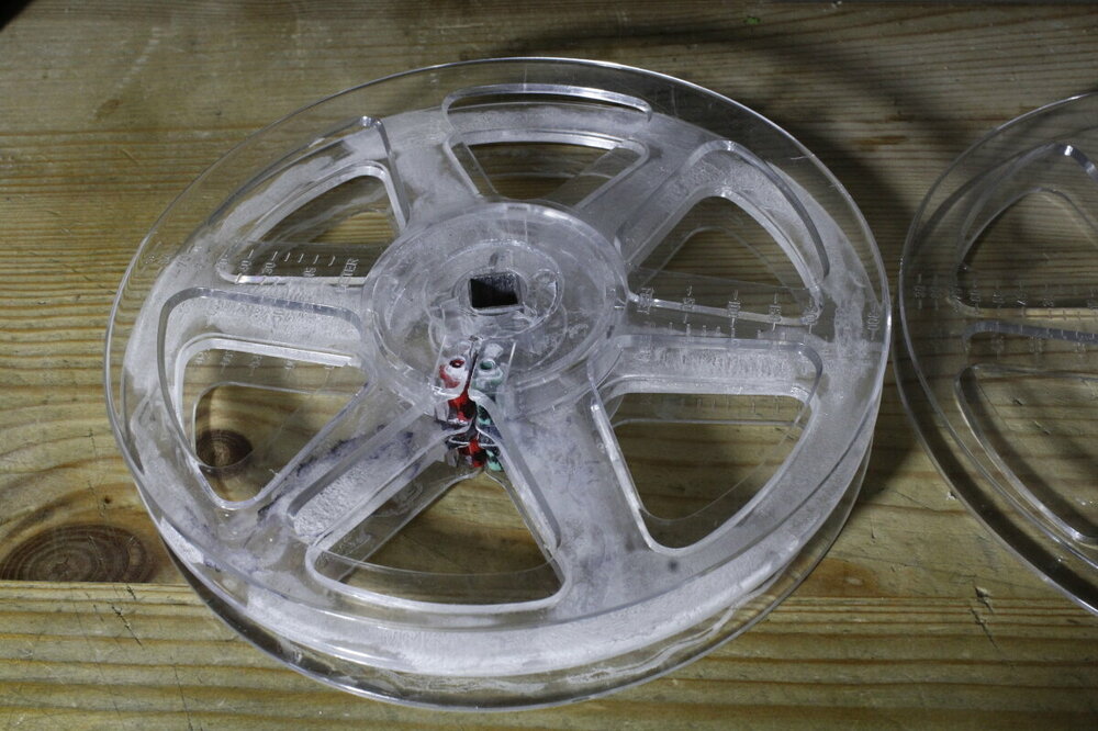 hier meine Super 8 Spule, 32,5cm für 550 Meter Polyester oder 480 Meter Azetat 3D Druck4 Punkte