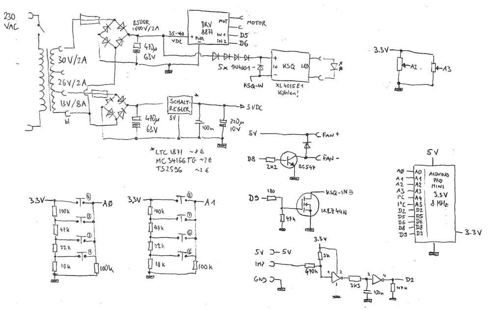 Lieber Harald, ich habe den Schaltplan jetzt mal rekonstruiert, unten hängt er an. Ins Reine Zeichnen kommt noch, vielelicht auch eine Platine, aber das ist alles kein Hexenwerk: Fangen wir links oben an: Zu sehen ist der Trafo des Noris mit seinen verschiedenen Abgriffen. de 13V/8A Abgriff geht normalerweise an die Kaltlichtspiegellampe, ich mache aus den 13V mit einem kleinen Schaltreglermodul aus der Bastelkiste stabilisierte 5V für den Arduino (und potenziell auch für den Raspi, aber das steht noch aus). Die 26V/30V Abgriffe sind iirc für 18 vs 24 fps gedacht, also Motorstrom, ich nutze nur den 30VAC-Abgriff, richte ihn gleich und siebe. Die gleichgerichtet 35-40 VDC gehen direkt an das "DRV8871 Breakout Board", das ist der Motorcontroller. Gibt es von Adafruit, oder baugleich auch als China-Klon. D5 udn D6 am Motorcontroller bezeichnet hier die Verbindung mit Pin D5 und D6 des Arduino, der hierüber den Motor steuert. Die vier seriellen Dioden reduzieren die Spannung für die Konstantromquelle (zum Betrieb der LED) etwas, da ich deren Elkos nicht so am Limit betrieben wollte. Die KSQ ist auch ein fertiges Modul auf Basis des XL4015 Chips. Ich verwende zum Beispiel dieses. Wichtig ist, eine Version mit zwei Spindelpotis zu finden, denn nur die erlaubt eine Begrenzung des Ausgangsstroms für KSQ-Betrieb. Auf meinem Chip klebt ein Mini-Kühlkörper (von einem Raspi-Gehäuse-Kit), da er mir ein bisschen zu warm wurde im Dauerbetrieb. Der Pluspol der KSQ hängt direkt hinter den vier Dioden, der Minuspol wird über den IRLZ44N MOSFET geschaltet (siehe Mitte unten). Hier tut's wohl auch quasi jeder andere, aber den gab meine Bastelkiste eben her. Über dem MOSFET sieht man den Transistor, der das LED-Lüfterchen anschaltet, sobald die LED an ist. Die Taster-Kaskaden unten Links sind die Bedientasten (der Anschluss an Analogports spart Pins). Ganz unten in der Mitte bereiten zwei Schmitt-Trigger aus einem 74HC14 die Impulse des optischen Sensors auf, der meldet, wenn die Motorwelle eine Umdrehung gemacht hat (QRE1113, exakt wie beim Synkino). Das kann man natürlich auch über Hall-Sensor oder Reed-Kontakt lösen. Ich mags halt optisch. Die beiden Trimmer rechts oben sind nur zum Einstellen der Motordrehzahl im Step- und im Laufbetrieb. Wenn ich Filme mit dem Scanner zurückspule, drehe ich das Dauerlaufpoti gern mal höher. Wichtig ist noch, dass der Arduino Pro Mini die 3.3V Version mit 8 MHz ist, nicht die übliche 5V-Version — und zwar, weil der Raspi I2C nur mit 3.3V verträgt und ich mir die bidirektionalen Pegelwandler sparen wollte. Die 3V3 im Plan kommen auch alle vom VCC Pin des Pro Mini. Man kann das ganze prima auf eine Lochrasterplatine aufbauen. Meine soll aber bitte nicht Beispiel sein, da sie "fliegend und planlos" entstanden ist. 🙂 Eigentlich ist das schon alles, der Rest der Logik steckt im Arduino (Repo-Link siehe oben). Bei Fragen bitte fragen!1 Punkt