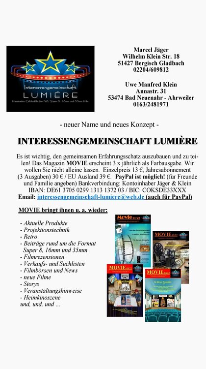 Grüß Euch, liebe Schmalfilmkameraden! Bin wieder vertreten, nur mit dem Selber- Ausarbeiten aufgrund nicht geeigneter Räumlichkeiten hapert es, was mich sehr traurig stimmt. Zum Thema: Anfangs wurde eine Normal 8-Kamera empfohlen. Mein Tipp wäre die Beaulieu MR8 und da benötigt man auch keine Batterien. Es ist jedenfalls meine Lieblings-N8-Kamera. Schöne grüße an Euch alle!1 Punkt