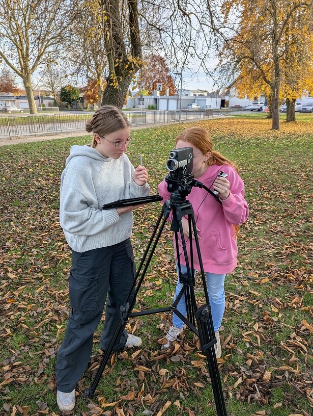 [Die Eltern aller im Folgenden abgebildeten Minderjährigen haben ihr Einverständnis zur Veröffentlichung von Bildern im Internet gegeben] Wo war ich steheh geblieben....? Ach ja: Die Werbung war erfolgreich und drei neue Schüler (zwei Jungs und ein Mädchen) sind zu meiner Gruppe dazu gestoßen. Nach einer kleinen Einführung in das Prinzip der analogen Fotografie, die meine alten Hasen den neu dazu Gestoßenen geben konnten, war es Zeit für den nächsten Film, der den Titel „Experimentalfilm“ auch wirklich verdiente. Alt Thema habe ich Doppelbelichtung in den Raum gestellt. Wir haben schon im ersten Durchgang vor zwei Jahren eine Reihe von „Geisterfotos“, also doppelt belichtete Fotografien gemacht, in denen wir mit dem Effekt der „durchsichtigen“ Personen gearbeitet haben. Meine Gruppe wollte also unbedingt (es war auch Oktober und ging auf Halloween zu) einen „Geisterfilm“ drehen. Es wurde also eifrig an einem kleinen Drehbuch gearbeitet, welches ich auf Machbarkeit mit der zur Verfügung stehenden Filmtechnik überprüfte. Wenn man doppelt belichten möchte, bietet sich natürlich Single 8 an. @Jürgen Lossau wird es freuen, dass alle bislang erstellten Filme mit Single 8-Kameras entstanden sind. Der erste, weil eine Fujica P2 eben wirklich handlich und idiotensicher ist, der zwei Film aufgrund des künstlerischen Potentials, das bei Single 8 eben deutlich höher ist. Meine Auswahl an Kameras ist überschaubar und die einzige kurbelbare Kamera, die ich besitze (außer natürlich den Bolex H-Kameras) ist eine Fujica Z2. Nun wirklich nicht die beste Single 8-Kamera, aber eben meine. Immerhin habe ich ein tolles Original-Kabel zum Verwenden des Handgriffs als Fernbedienung, so dass wir wackelfrei mit Stativ arbeiten konnten. Neben den Schauspielern waren zwei Kameramädchen notwendig. Der Framecounter musste genau im Blick behalten werden, denn es musste ja auf einen genauen Wert zurück gekurbelt werden. Darüber hinaus musste auch die Öffnung der Sektorenblende gesteuert werden (offen bei einfach belichteten Abschnitten, halb geschlossen bei doppelt belichteten. Wir waren also gar nicht so unprofessionell unterwegs… ch Doppelbelichtung in den Raum gestellt. Wir haben schon im ersten Durchgang vor zwei Jahren eine Reihe von „Geisterfotos“, also doppelt belichtete Fotografien gemacht, in denen wir mit dem Effekt der „durchsichtigen“ Personen gearbeitet haben. Meine Gruppe wollte also unbedingt (es war auch Oktober und ging auf Halloween zu) einen „Geisterfilm“ drehen. Es wurde also eifrig an einem kleinen Drehbuch gearbeitet, welches ich auf Machbarkeit mit der zur Verfügung stehenden Filmtechnik überprüfte. Wenn man doppelt belichten möchte, bietet sich natürlich Single 8 an. @jürgen wird es freuen, dass alle bislang erstellten Filme mit Single 8-Kameras entstanden sind. Der erste, weil eine Fujica P2 eben wirklich handlich und idiotensicher ist, der zwei Film aufgrund des künstlerischen Potentials, das bei Single 8 eben deutlich höher ist. Meine Auswahl an Kameras ist überschaubar und die einzige kurbelbare Kamera, die ich besitze (außer natürlich den Bolex H-Kameras) ist eine Fujica Z2. Nun wirklich nicht die beste Single 8-Kamera, aber eben meine. Immerhin habe ich ein tolles Original-Kabel zum Verwenden des Handgriffs als Fernbedienung, so dass wir wackelfrei mit Stativ arbeiten konnten. Neben den Schauspielern waren zwei Kameramädchen notwendig. Der Framecounter musste genau im Blick behalten werden, denn es musste ja auf einen genauen Wert zurück gekurbelt werden. Darüber hinaus musste auch die Öffnung der Sektorenblende gesteuert werden (offen bei einfach belichteten Abschnitten, halb geschlossen bei doppelt belichteten. Wir waren also gar nicht so unprofessionell unterwegs…1 Punkt