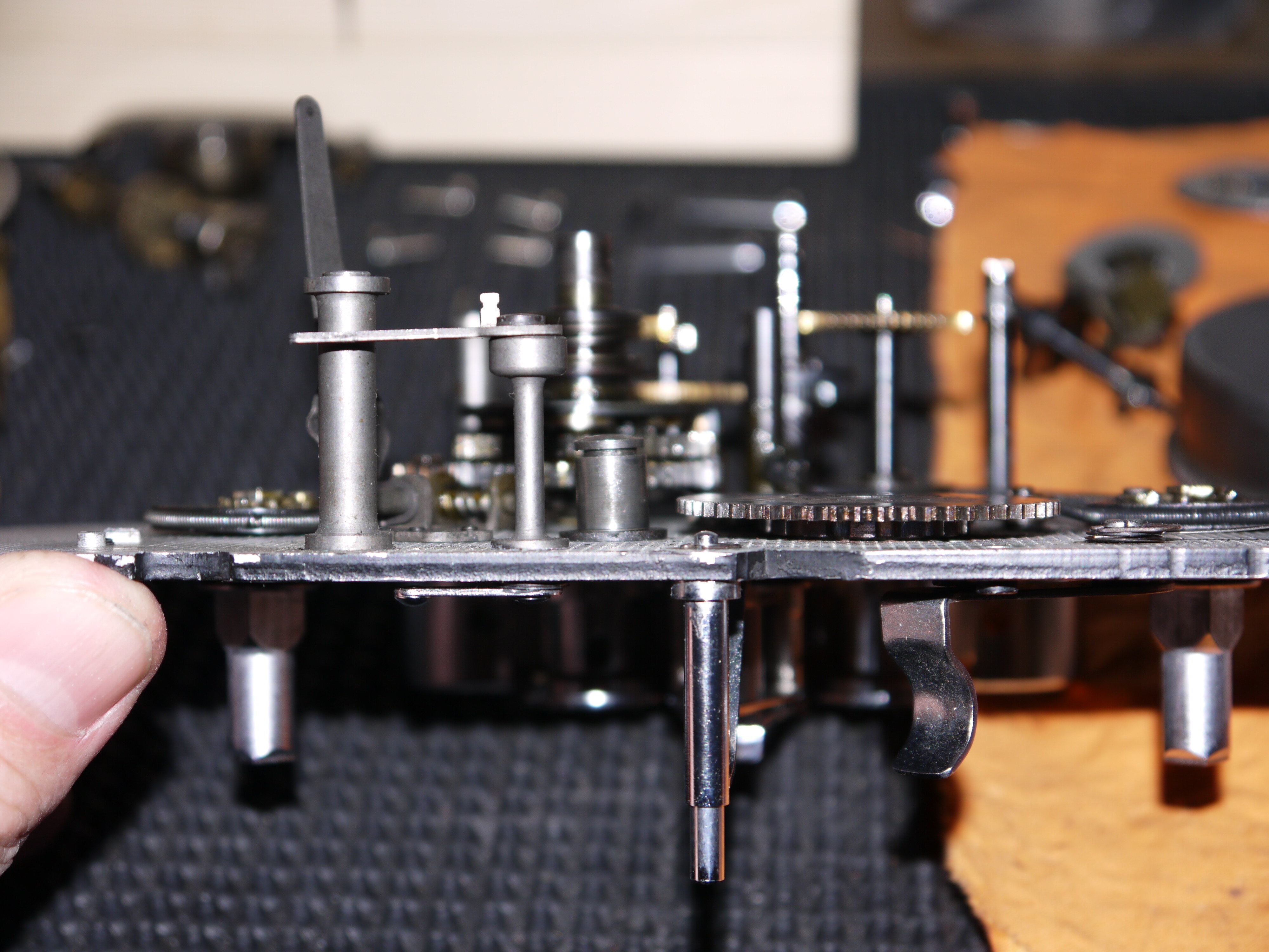 Betrifft Paillard-Bolex-H-Kameras ab Nummer 251501 Die Führungsbolzen des Sperrgetriebes sind mit der Hauptplatine vernietet. Es handelt sich um vier Zahnräder, zwei als eigentliches Sperrgetriebe, eines, das mit dem größeren Sperrrad fest verbunden ist, und ein Zwischenrad auf eigenem Bolzen. Ich habe nun (leider erst) festgestellt, daß der dritte Bolzen mit dem Zwischenrad oft, wenn nicht bei allen Kameras schräg steht, schiefgedrückt von den Kräften, die da zwischen diesen Zahnrädern und der Federbüchse auftreten. Ich werde das in Zukunft genau verfolgen bei jeder H, die ich bearbeite. Was nun immer mehr zunimmt, ist die grobe Behandlung von feinmechanischem Gerät. Ich kann meine Kunden und alle am Film Interessierten nicht erziehen und darf niemandem direkt die Wahrheit sagen, doch als verallgemeinerte Feststellung dramatisiere ich es hier: Wer aus eigener Tasche fünftausend Franken hinlegt für eine H-Kamera, sei es 1937, sei es 1967, die oder der hat eine andere Beziehung zu ihr als jemand, die oder der so ein Ding in letzter Zeit auf dem Flohmarkt oder bei ebay für ein paar Mäuse gekauft hat. Es gibt auch Leute, die es nicht akzeptieren, daß eine Revision das Fünffache dessen kosten soll, was sie für die Anschaffung auslegten. Das bedeutet, daß die Kamera für sie exakt den Gebrauchswert des Anschaffungspreises besitzt. Man kann das so sehen. Ein Drama spielt sich dann in dem Moment ab, da eine Funktion nicht mehr gegeben ist, und es ist dann aber nicht mehr ein Drama in der Kamera, sondern eines in der Seele. Genau zeitgleich bin ich dann nur noch Techniker, weil man bis dahin meine Erklärungen und meinen Rat in den Wind geschlagen hat, wozu man natürlich das Recht hat. Paillard hatte für H-Kameras ab oben stehender Nummer die Sperrgetriebeteile einzeln zum Kauf angeboten, Serviceleute in Verbindung mit der Firma konnten also eine Schwäche der Konstruktion wenigstens für eine unbestimmt lange Zukunft beheben, aber die verbogenen Bolzen aus der Platine nehmen geht nur mit Zerstörung der Nieten, man muß sie wegbohren oder -fräsen. Also auch das Ersatzmaterial war nicht für raschen Wechsel konstruiert, sonst wäre das zu verschrauben oder mit Sprengring zu befestigen oder sonstwie gemacht worden. Sie war, ist und bleibt eine in Teilen lausige Amateurkamera, zu der heute Ersatzteile immer schmerzhafter fehlen. Das Bewußtsein des eigenen Konsumverhaltens fehlt auch.2 Punkte