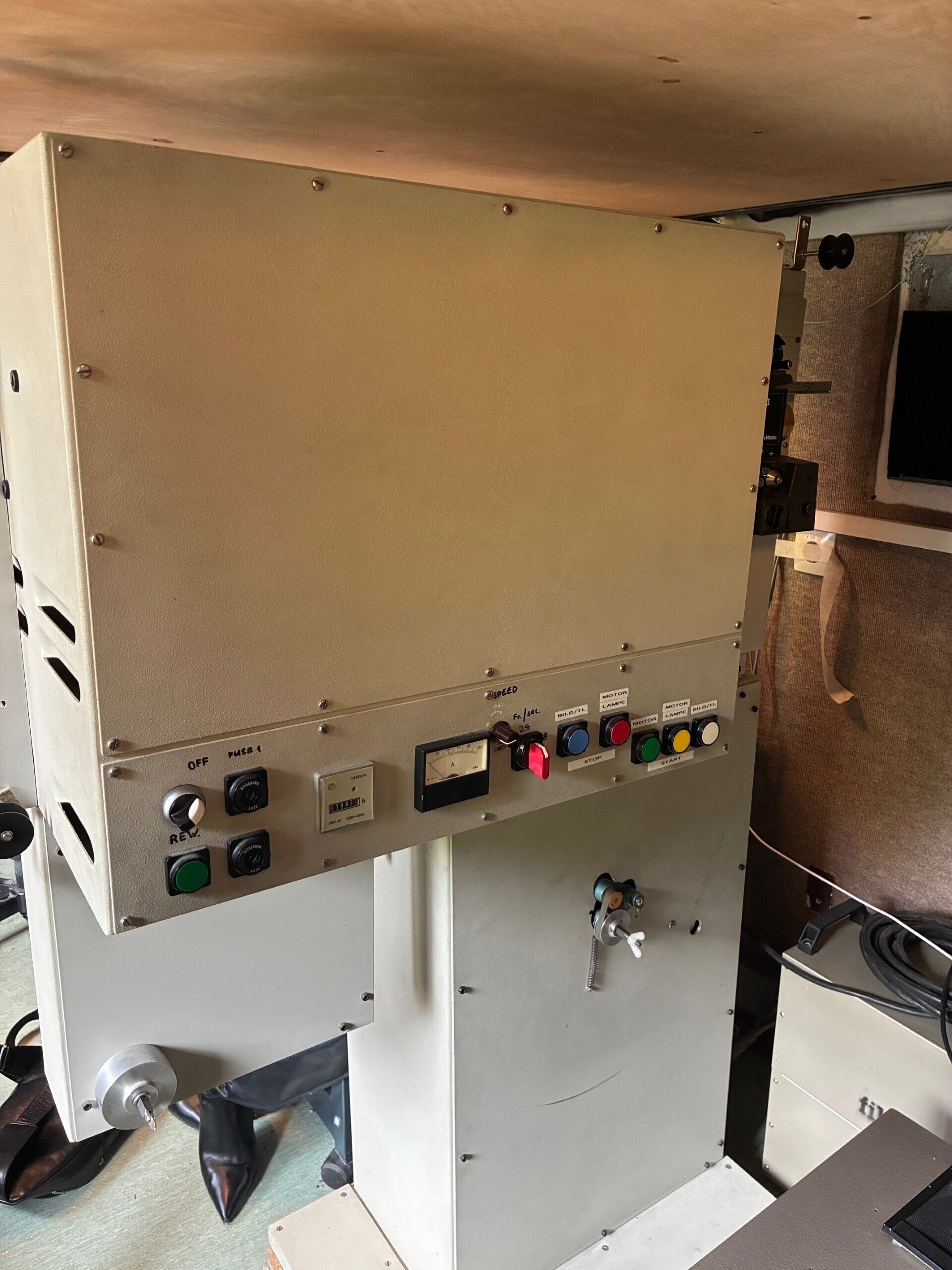 Hallo zusammen meine Lieben! Wir verschenken eine vollständige und sofort betriebsbereite Stumpf 16 mm Standmaschine mit 1600 W Xenon inklusive elektronisch gekoppeltem 16 mm Zweibandlaufwerk (Zweibandlaufwerk ist so groß wie ein Bauer P7). Die Maschine faßt problemlos 1500 m Spulen und hat eine gewichtsabhängige Aufwickelfriktion. Licht- und Magnettonwiedergabe (jeweils XLR Anschlüsse für den Vorverstärker. Umschaltbar von 24 auf 18 Bilder pro Sekunde, sowie eine eingebaute stufenlose Geschwindigkeitsverstellung über Drehknopf. Der Xenonspiegel hat seit Jahrzehnten einen Sprung, tut aber problemlos Dienst ohne optische Fehler in der Projektion. Maschine läuft einphasig. Irem Gleichrichter (blau, 75 A) gibts auf Wunsch kostenlos dazu. Maschine wird aktuell von mir fachmännisch zerlegt und liegt dann in Einzelteilen zum Abtransport bereit. Die auf dem Bildern zu sehenden Wittner-Umlenkrollen und das Objektiv muß ich allerdings für die Selecton, die stattdessen aufgebaut wird, behalten und sind somit nicht dabei. Standort ist Duisburg. Abholung bis allerspätestens bis zum 8.5., denn am 11.5. ist der Schrotthändler schon bestellt. Desweiteren verschenken wir noch mehrere Ernemann 8 und 8B und weiteren Kinokrempel wie zB alte Riesenscheinwerfer bis zum gleichen Datum. Nun gebt Euch einen Ruck und holt das Zeug hier ab, damit das nicht alles in den Schrott geht. Gruß Martin2 Punkte