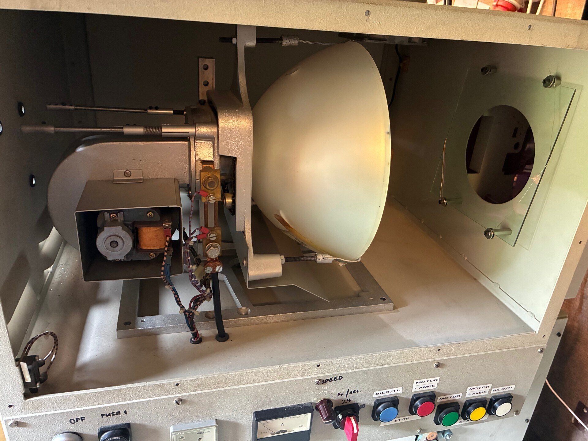 Die Abdeckung am Spulenarm lässt sich nach lösen von zwei Kreuzschlitzschrauben abnehmen. Darin liegen die Kunststoffzahnräder im Originalfett, welches inzwischen so zäh ist dass nichts mehr umgeht. Natürlich habe ich das alte Fett entfernt und neu geschmiert. Klar, jetzt musste ich an allen gefetteten Stellen so verfahren. Zum Schluss habe ich alles wieder zusammengebaut und probehalber den alten Antriebsriemen wieder eingebaut. Jetzt lief der Projektor schon ganz ordentlich, allerdings etwas unruhig. Natürlich habe ich abschliessend den neuen Riemen eingebaut und gleich einen Film eingelegt. Läuft fast wie neu, war mein Eindruck.3 Punkte