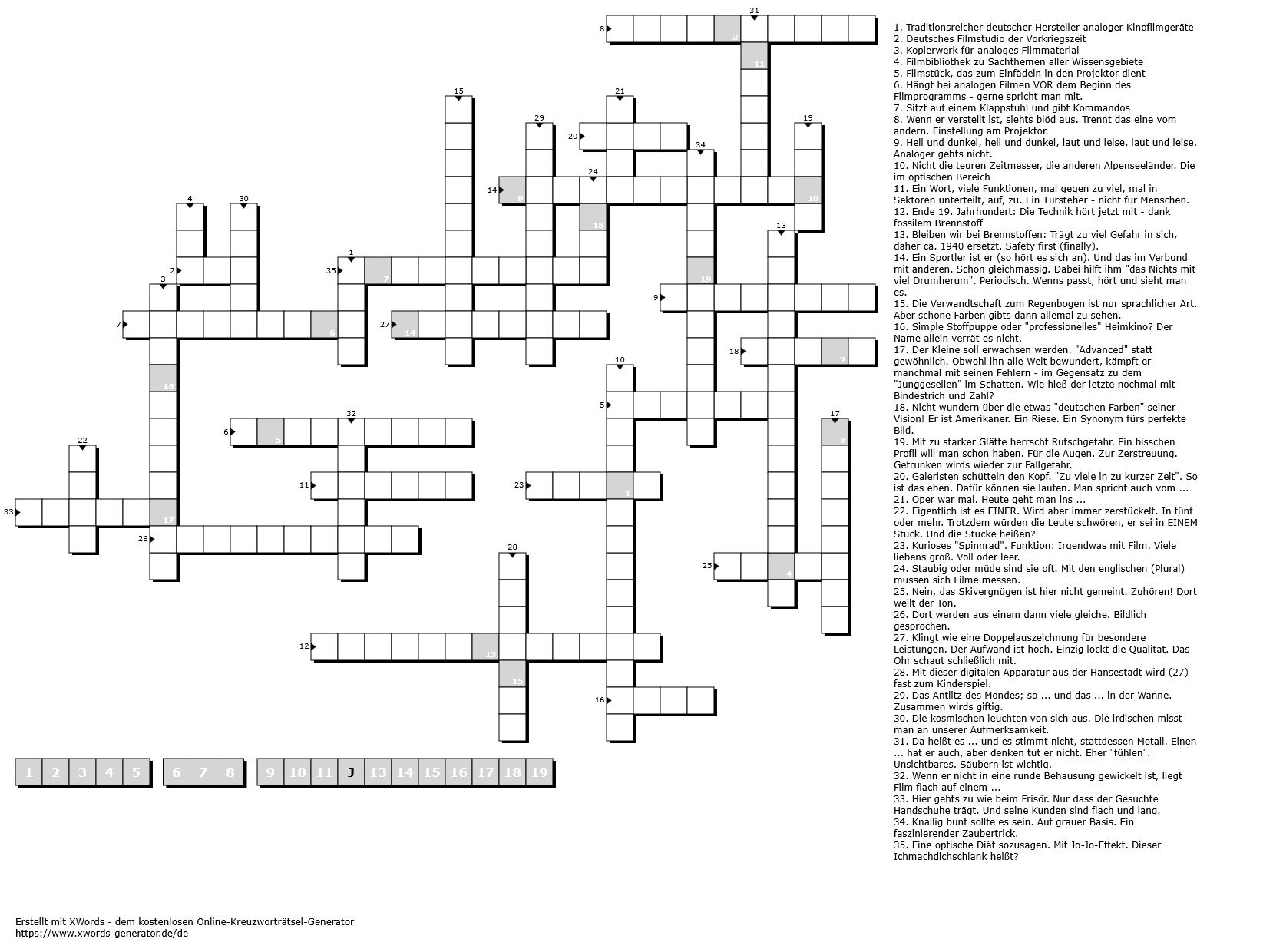 Hallo und guten Morgen @all, habe hier mal ein Kreuzworträtsel rund ums Thema Filmen und Filmtechnik erstellt. Mit genau 35 trickreichen Rätselfragen. 😉 Habe hin und wieder ganz schön schelmisch in mich hinein gekichert beim Erstellen der Fragen. An manchen Stellen muss man nämlich ganz schön um die Ecke denken. Unter Umständen sogar um zwei Ecken. Und nicht alles wörtlich nehmen. Oder eben gerade doch. 😁 Okay, manchmal ists auch einfach. Das ist mein fröhlicher Neujahrsgruß an Euch. Gesundes, lustiges, neues Jahr 2026. Ich hoffe, es gefällt. Viel Spaß beim Lösen. Kann man hier auch Vektorgrafiken anhängen? Ich werds gleich rausfinden. XWord Rätsel(10).svg Sieh an, man kann. PS: (Ich hoffe, es steckt nicht allzu viel fachlicher Schmarrn drin. Simon, bitte sei nachsichtig mit mir! 😄 )1 Punkt