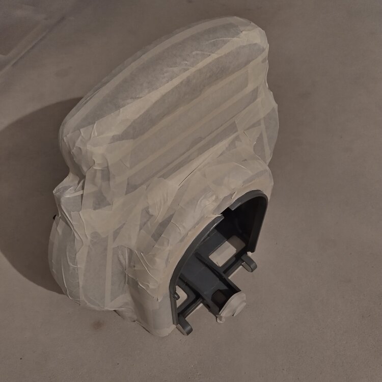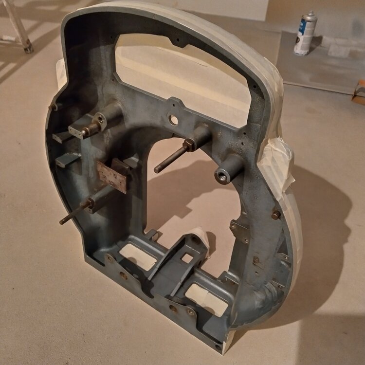 Vielleicht für den ein oder anderen hilfreich: Das hintere Gehäuseteil ist nun von allen Anbauteilen befreit, gereinigt (auch wenn's nicht so aussieht) und zum Lackieren durch Anschliff und Abkleben vorbereitet. Wie schon im Treat vorher beschrieben, die Außenfläche mit dem originalen Hammerschlaglack bleibt wie sie ist. Ich habe sogar einige Kratzer und Dellen auspoliert. Damit bleibt dem Lampenhaus und somit dem ganzen Projektor sein Vintage-Touch erhalten. Foto mit der Endlackierung folgt..🎨2 Punkte