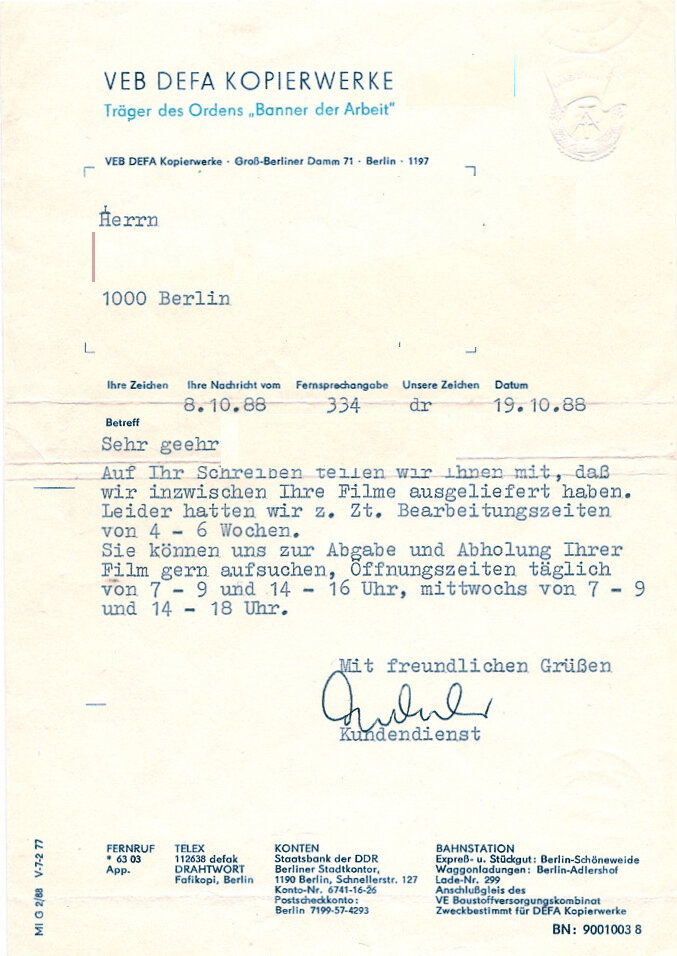 Für die bloggenden Dampflokfilmer unter Zeitdruck mag es sich empfehlen, künftig eine Expressentwicklung bei Andec zu buchen, zum Aufpreis von 89,25 Euro brutto. Dazu dann nich einen zuverlässigen Kurierservice, dann ist der Film auch ratzfatz wieder zurück. Ich hatte einmal wirklich außergewöhnlich lange Wartezeiten beim VEB DEFA Kopierwerk, als ich einen Schwung russischer Schwarzweißfilme von einer Mexico-Reise im Sommer 1988 nach Wochen vergebenen Wartens schon verloren glaubte und einen Suchauftrag an das DEFA-Kopierwerk schickte. Zu meiner großen Verblüffung lag Wochen später ein sehr netter Brief in meinem Westberliner Briefkasten - und ich konnte die Filme kurz darauf in meinem Postfach am Bahnhof Friedrichstraße abholen. Andec hatte damals keine Chemie, um diese Filme typgerecht zu entwickeln; die Ergebnisse waren meist sehr kontrastarm. Da der Entwicklungspreis ohnehin im Kaufpreis von 13,10 M inkludiert war, nahm ich den kleinen Grenzverkehr gerne auf mich und bekam dafür stets bestens entwckeltes brilliantes kontrastreiches Schwarzweißmaterial, das es zu diesem Zeitpunkt im Westen schon längst nicht mehr gab. Das Labor in Lausanne habe ich 1993 im Rahmen einer Kodak-Promo-Tour besuchen dürfen. Damals war die Super-8-Entwicklung schon längst jenseits des großen Booms in den 70ern, und die Konfektionierstaße zum Befüllen der Kassetten wurde auch nur noch ein oder zweimal im Jahr in Betrieb genommen. Damals hätten wir keineswegs gedacht, dass Kodachrome noch 13 weitere Jahre produziert und entwickelt werden würde. Es gab mal eine sehr schöne TV-Doku von Jürgen Lossau über die letzten Tage der Super-8-Entwicklung in Lausanne im Jahre 2006. Vielleicht wäre es interessant, zum 20jährigen Jubiläum des Endes der Kodachrome-Produktion im nächsten Jahr diesen Film noch einmal wieder sichtbar zu machen. Super-8 ist auch für mich preislich nicht mehr vertretbar, zumindest nicht im privaten Rahmen. Als ich Jürgen Lossau vor einiger Zeit nochmal darauf ansprach, dass seine Promo-Aktion 2011 mit einem Preis von 25 Euro für eine Kassette E100 inklusive Andec-Entwicklung, HD-Scan bei Screenshot und 3 Schmalfilm-Heften für einen Sommer lang mein Feuer für dieses Format nochmal entfacht hatte, konnte er es kaum glauben, dass das damals zu diesem symbolischen Preis möglich war. Kodak hatte wohl die Kassetten aus der letzten Produktionsphase als Sponsororing spendiert. Im privaten Rahmen kann und mag ich für Filmmaterial einfach nicht mehr die aktuellen Preise zahlen. Aber so kleine glückliche Zufälle sind dann doch immer wieder ganz nett. Ich kann nur hoffen, dass die Produktion von Filmchemie und Filmen den letzten noch verblieben Laboren noch ein paar Jahre ausreichend Aufträge bescheren wird. Aber wer weiß das schon. Dass sich Andec noch rechtzeitig aus der Cinegrell-Insolvenz befreien konnte, ist ganz erstaunlich - aber das wird in diesen schwierigen Zeiten ein harter Kampf um die Aufträge werden.2 Punkte
