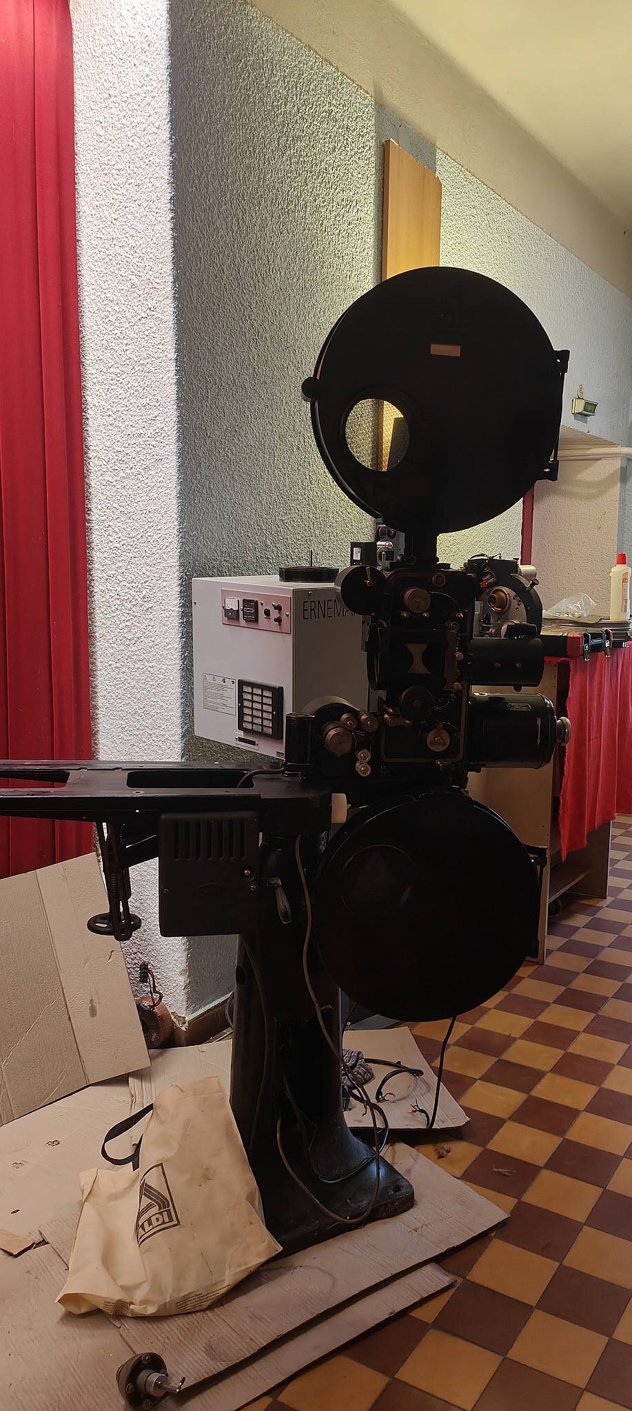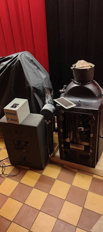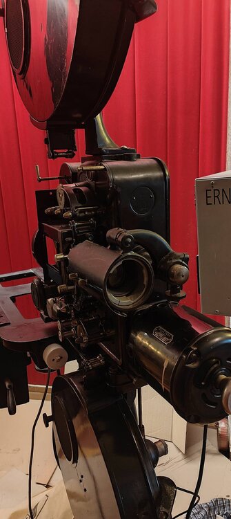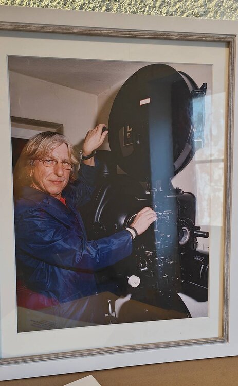 Dirk hat einen Ernemann IV Filmprojektor hinterlassen, den er vor vielen Jahren in Rostock als junger Mann der Leiterin der Filmdirektion abgeschnackt hatte. Wieder aufgebaut und in seiner neuen Wohnung im Dachgeschoss aufgestellt, bekam der Projektor ein West Kohle Lampenhaus von Zeiss Ikon Kiel verpasst. Ich bin dabei den Projektor wieder zusammenzusetzen, und ihn im Foyer aufzustellen, zusammen mit seinen geliebten Fachbüchern, Klebepresse und Bild. Als Erinnerung an einen lieben Menschen, guten Freund und jemand, der auch bei uns im Haus in sozialistischer Zeit bei Bedarf Vertretung der Vorführung übernommen hatte. Nun ist nur die Frage, soll ich das West Lampenhaus nutzen, oder ein Artisol 75, das yu einer E IV aus der Vorkriegszeit passen würde, jedoch nicht yur Dresdner VEB Version.1 Punkt