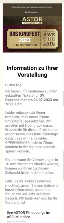 Hallo Stefan, ich kenne diese spezielle DP70 sehr gut aus ihrem vorherigen Leben in einem anderen Münchner Kino - bevor sie auf nicht ganz sauberen Um(n)-Wegen ins Astor gelangt ist. Sie hat in dieser aktive Zeit regelmäßig ihre Verschleißteile (Antriebsrad Blende & Antriebsrad Malteserkreuz auf der Königswelle) bekommen. Zudem hat sie vor dem Einbau ins Astor ein Überholungsprojekt bei einem namhaften süddeutschen Kinotechnik-Dienstleister genossen... 😉 Also am Wartungszustand sollte es daher eigentlich nicht liegen, wenn es einen Ausfall gegeben hat. Ach ja, ohne Bildstrich einzulegen sollte ein Vorführer "blind" können, bevor er auf eine 70mm-Kopie losgelassen wird. Ein leichtes Blendenziehen am Ende eines Verstellweges, der niemals ausgenutzt werden sollte, ist IMHO somit kein Konstruktionsmangel.