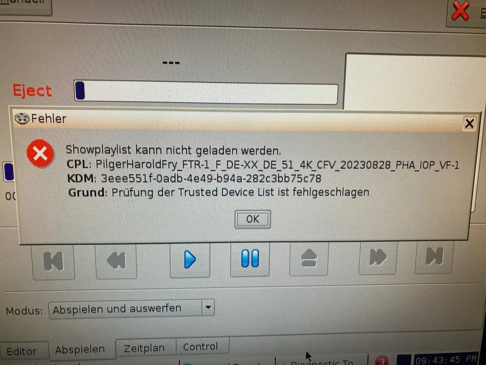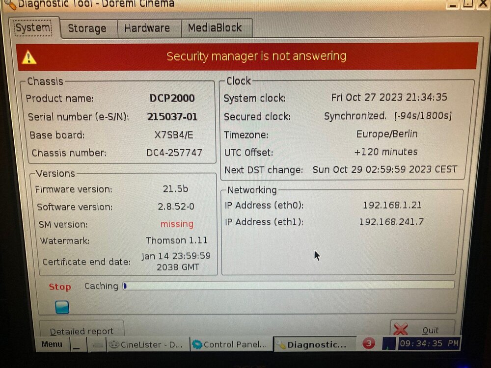 Testweise hab ich aus Jux und Dollerei auch mal probiert, die Netzwerkverbindung durch abstecken des Kabels zu trennen. Wie erwartet, spielt er dann auch keinen Content ab, aber der Securitymanager wird im Diagnostic Tool weiterhin als vorhanden angezeigt, also kann es nicht an einem Kommunikationsproblem mit dem Projektor liegen. Grüße Martin
