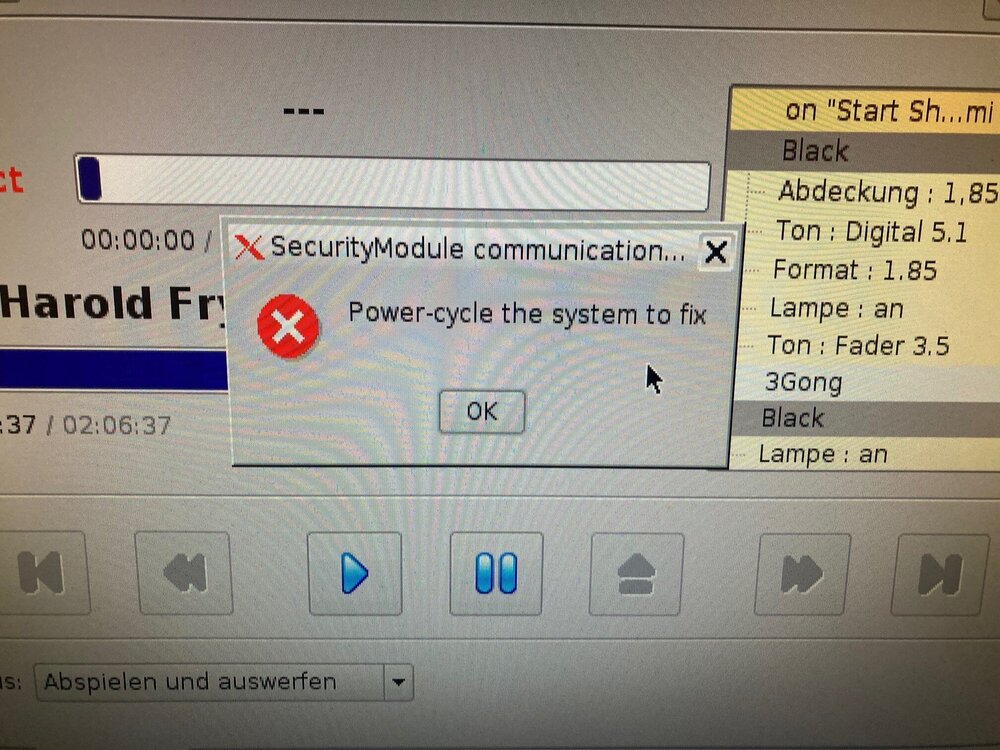 Hallo Leute! in Saal 2 haben wir eine Doremi Dolphin / HDSDI Kombination mit einem Barco Projektor. In diesem Saal haben wir aufgrund der extremen Temperaturschwankungen immermal wieder Kontaktprobleme an der unterschiedlichsten Bauteilen - hauptsächlich Kommunikationsanschluß Lampenhaus / ICP Board Stecksockel, einmal Kontaktprobleme der Steckkarten auf dem Mainboard des Projektors. Deshalb tippte ich beim aktuellen Fehler auch zunächst auf Kontaktprobleme. Es fing vor etwa einem halben Jahr an. Da ist während der Vorstellung mitten im Film der Ton ausgefallen. Keinen Ausschlag mehr am Prozessor. Nach Serverneustart alles ok. Dann kam es ab und zu zu Fehlermeldungen bezüglich Security Manager is not answering im Diagnostic Tool auf der Registerkarte System. Ein Serverneustart behob das Problem bisher immer. Außerdem betraf es NIE die erste reguläre Vorstellung am Tag, selbst, wenn ich vorher tagsüber Content getestet habe und der Server den ganzen Tag durchlief. In der letzten Woche verstärkte sich das Problem, so daß bei jedem zweiten Spieltag dieser Fehler zur Spätvorstellung auftrat und durch einen Serverneustart bisher immer behoben werden konnte. Der Projektor brauchte nie mit neu gestartet zu werden. Ich hatte zusätzlich vorige Tage noch das Problem, daß in der Vorstellung das Bild weg war, aber der Ton weiterlief, auf der Bildwand waren dieses typische weiße Grieseln zu sehen, was man beim Barcoprojektor bei der Formatumschaltung bei offener Bildklappe sehen kann - nach Serverneustart alles wieder ok. Und gestern Abend ging dann garnichts mehr. Zusätzlich - so sagte der Kollege, sei angeblich noch der FI vom Projektor geflogen. Ich bin dann gekommen und nach mehrmaligem hochfahren gab es unterschiedliche Fehlermeldungen: Ich habe daraufhin - Vorstellung ist ja eh ausgefallen - heute Nacht den Server ausgebaut und geöffnet. Das Gerät war innen sauber. Ich habe die Platinen abgeklopft und ein bißchen dran genottelt. Dann habe ich die internen Verkabelungen kontrolliert, dabei ist mir eine fast gänzlich lose Kabelverbindung aufgefallen und zwar der linke schwarze Stecker im folgenden Bild: Danach habe ich den Server zusammengebaut und angeschlossen - lief wieder alles einwandfrei. Ich habe dann noch über eine Stunde wechselweise unterschiedlichen verschlüsselten Content gestartet, bestimmt 200 Mal, ohne weiteren negativen Befund. Als am Abend garnichts mehr ging, konnte auch kein unverschlüsselter Content abgespielt werden. Vielleicht kennt jemand das Problem und hat ne Ahnung, in welche Richtung man suchen könnte. Liebe Grüße und vielen Dank schonmal! Euer Martin