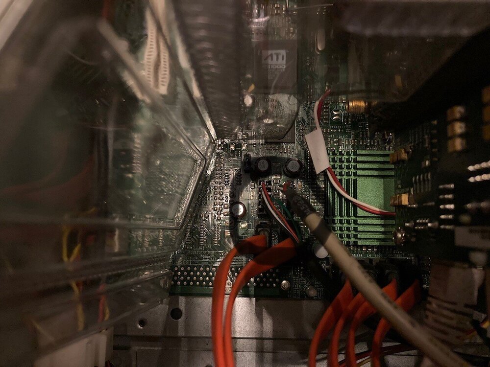 Der schwarze Stecker, wo das rote, weiße, schwarze und grüne Kabel reingehen, lag fast nur noch lose auf den Steckkontakten des Mainboards auf.