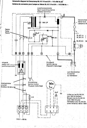 Du meinst sicher das BL9X/.. , wie es original als Xenonlampe zu Bauermaschinen gehört(e). Im Anleitungsbuch befindet sich kein Schaltplan, das Teil ist aber auch nicht komplex. In der Netzzuleitung von der Lüsterklemme liegt die Sicherung (T 1,6) und ein Netzfilter, welches sicher kaputt ist, wenn nicht schon mal getauscht. Dann kommen einen Serienschaltung aus den Türkontaktatern (gedrückt geschlossen (-->Tür zu) und dem Zünddrücker an der Rückwand "Blitzpfeil-Taste". Dann zum Zündgerät, 2 Pol von dort zurück zur Lüsterklemme über das Netzfilter. Der Gleichstrom führt über ein Hochstromrelais, welches Lüftermotor für den Hilfsspiegel und den Stundenzähler steuert. Dann liegt im Hochstromkreis noch ein Nebenwiderstand für das Strommeßgerät. Der Unterschied des "Siemens (Osram)" Zündgerätes gegenüber der Bauch Version ist, daß der Teslatrafo eine galvanisch getrennte Primär und Sekundärwicklung hat, was aber von der Wirkweise genau gleiche Ergebnisse bringt. Wichtig ist noch: An der Linken Seite ist ein Erdungspunkt. Dieser ist mit >16 mm² Cu zum HPA Sternpunkt zu führen! Entstörung! Grüße: Stefan