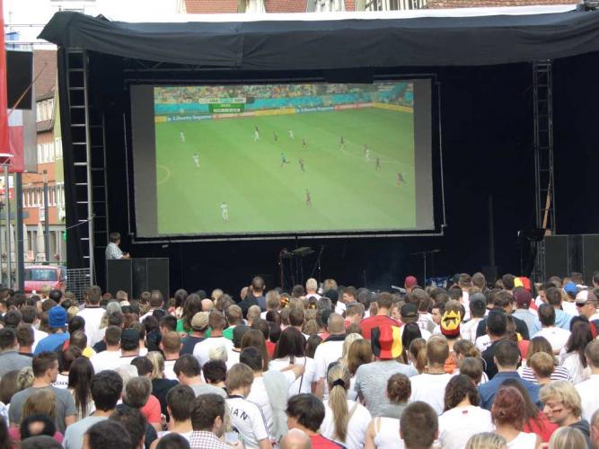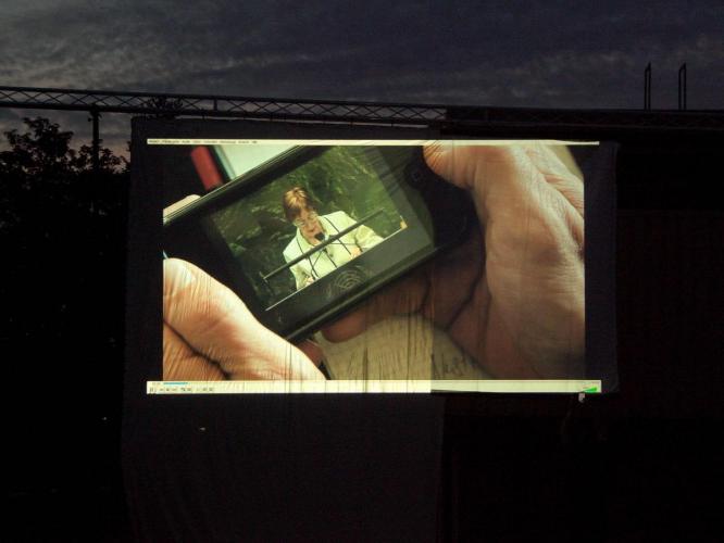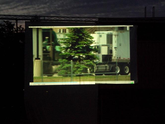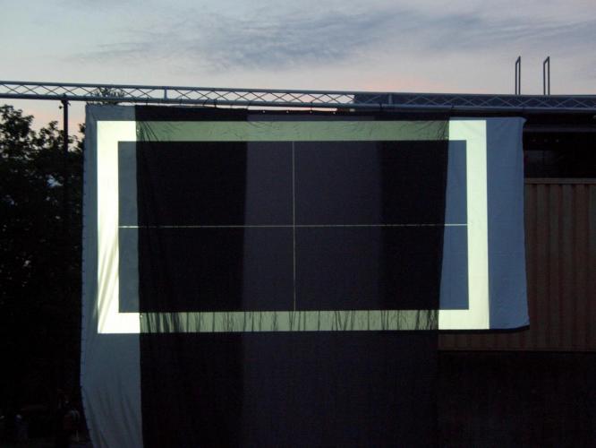 Der Projektor steht im LKW, allerdings hinten offen. Lärm ist kein Problem, steht genug "Holz" da, Center ist geflogen, und Endstufenleistung samt Schalldruck ist bei Vollhorn kein Problem. Bei der Aufstellung stellt sich immer die Frage, ob die Sonne hinter dir steht oder man in die Sonne schaut. Wir haben uns für "Hinter Dir" entschieden, weil dann das Auge eher die Leinwandhelligkeit als die Sonne adaptiert und etwas empfindlicher ist. Und die Leinwand möglichst hoch gehängt, damit das Dach auch schattiert. Der vordere Dachvorhang kann noch 1m tiefer hängen, dann kommt man auch noch drunter durch und die Leiwnad wird unten auch noch dunkler. Jetzt mal morgen gucken, was man ohne Dach um 20.30 Uhr sieht, sofern das Wetter mitmacht. Jens