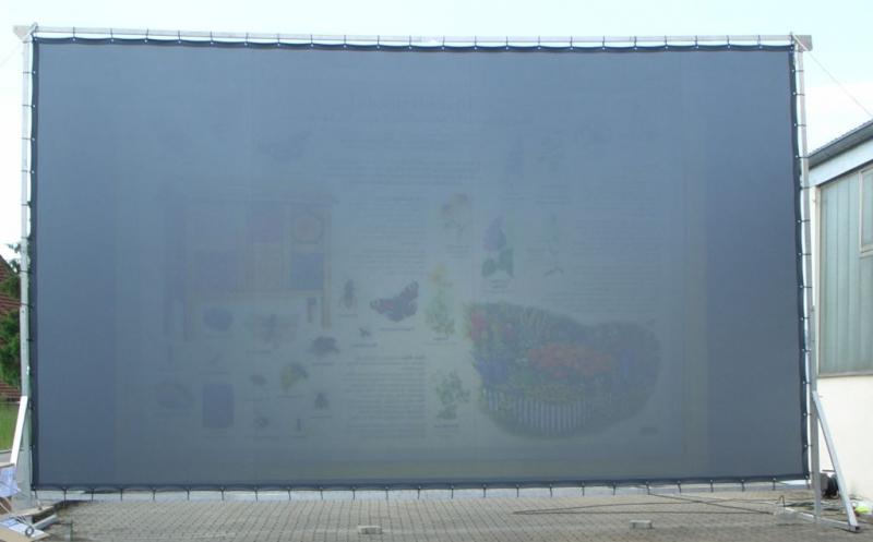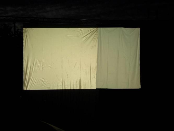 Carsten, Rückpro geht bei Tag besser als Aufpro. Gain ist nach vorne 1,25, nach hinten 0,14. Problem ist nur der enge Blickwinkel und das du von oben nach unten projizieren mußt. Deshalb hab ich ja auch die Bilder eingestellt. Anbei nun das Ergebnis von heute abend. Es hat sich herausgestellt, das die über 20 Jahre alte vergilbte Harkness 180 (vermutlich) das brauchbarste Bild liefert. Tagsüber ist sie fast Teergelb und reflektiert optisch weniger als die mattweiße, die rechts daneben hängt. Jedoch beim Projezieren glänzt sie fast wie eine Schweineschwarte und ist wirklich erheblich heller. Damit werde ich das am Donnerstag in einem mindesten 8m langen Tunnel in ca 8m höhe vom Boden weg versuchen. Jens