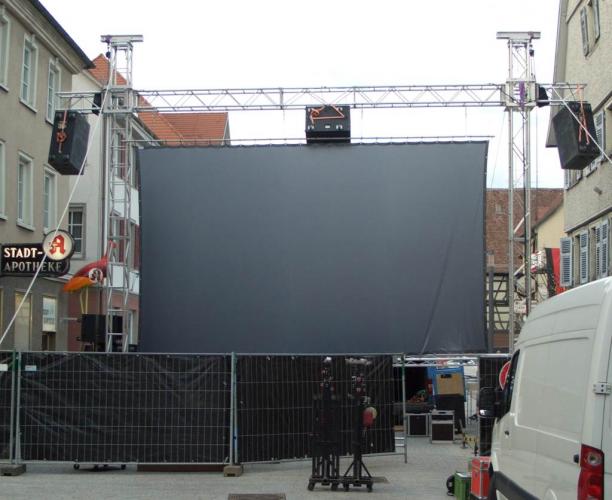 Kannst mit dunkler Leinwand und Rückpro ebenfalls knicken. Hab ich gemacht, war auch nicht zufriedenstellend. Die jetzige Lösung ist ein Bühnendach, seitlich und Hinten mit Mollton schwarz abhängen, Dach muß ebenfalls schwarz sein (Lichtdicht) und Leinwand möglichst weit oben drin hängen. Sind bei mir 8m Höhe des Daches innen und Leinwand ca. 7x4m, Muß mindestens 3m über dem Boden hängen, sondt sind ständig die Köpfe im weg. Also verstellbar bis auf 4m Höhe Unterkante vom Boden weg. Projektor R320 mit 4,2kW und dann Aufprojektion. Problem ist das Tageslicht. Das läßt auch eine fast schwarze Show-Folie grau erscheinen und du hast keinen Kontrast mehr. Aufprogainfaktor der Folie ist 0,14, damit läßt sich kaum etwas anfangen, Durchlicht ist so bei 1,25, damit kann man dann so ab 20m Abstand auf Achse schon ein brauchbares Bild sehen, wenn die Sonne nicht auf die Leinwand von der Seite scheint. Problem ist nur, das man aus der Nähe gar nichts sieht, weil man einfach über die Zuschauer darüber projiziert. Das versteht Mensch nur nicht und ist verärgert. In Talk hab ich vor ca. 3 Wochen dazu einige Bilder eingestellt. kannst ja mal gucken. Die Folie hat 7x4m und ist verfügbar. Ich werde jetzt noch einen Test machen, ob man mit einer Gain 1.4-1.8 Folie aus dem Kino mehr sieht als mit einer mit 1. Das aber eben im dunklem Loch. Jens