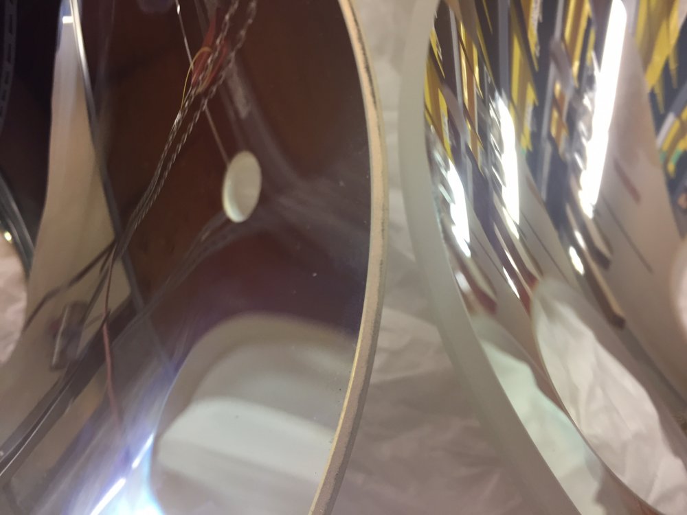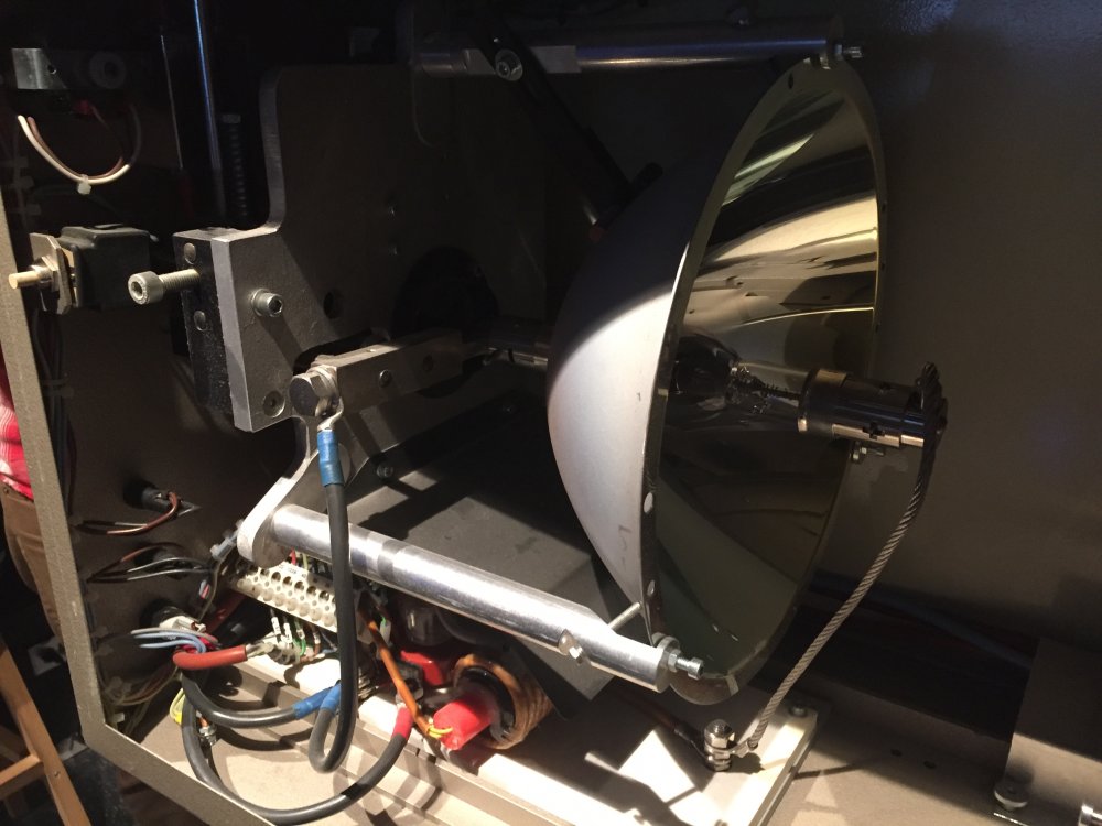 Habt Ihr schon mal dieses braune Zwischenstück gesehen? Das sieht nicht wie original Kinoton aus. Es handelt sich hier bei der 35mm Seite einer FP38D mit kleinem Lampenhaus mit 280mm Durchmesser Spiegel. Den gab es wohl in zwei Varianten, mit f2=560mm und f2=825mm, hier handelt es sich wohl um den ersteren. Mit dieser Verlängerung beträgt die Distanz von der Basis des Spiegels zur Filmebene etwa 50cm, das scheint also Sinn zu machen, sieht aber trotzdem komisch aus.