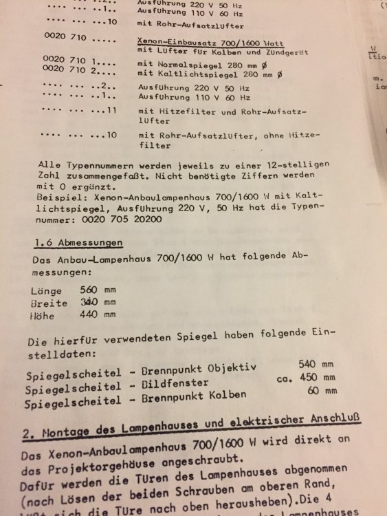 FP38D mit kleinem Kinoton LampenhausMichael Schaffer antwortete auf Michael Schaffer's Thema in Allgemeines Board Ahaaaa! Ja, das macht natürlich Sinn. Vielen Dank. Mittlerweile bin ich über dieses alte Handbuch zum XL1000 Lampenhaus gestolpert, und da wird der 280/60/540 Spiegel explizit beschrieben, die Entfernung zur Bildebene aber mit nur 450mm angegeben - das ist schon ein ziemlicher Unterschied. Das macht das alles ein bisschen verwirrlicher... Kann es sein, dass diese kurze Entfernung als unzureichend festgestellt wurde, und daher später dann diese zusammengebastelten Verlängerungsstücke eingesetzt wurden?