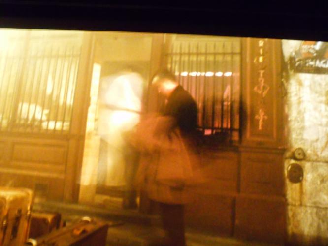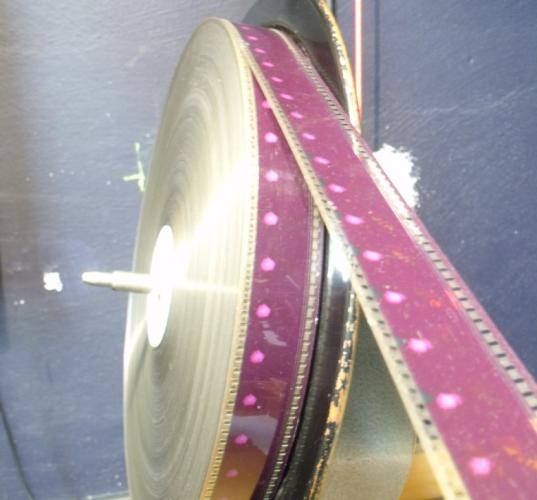 Ich hatte mal eine Kopie in Händen, die wohl noch wesentlich mehr 'gebraten' wurde. Das sah auf dem Umroller schon heftig aus, die komplette Oberfläche war rötlich geworden: Der Brandfleck war mehr oder weniger durchgehend schwarz, und mit Schärfe war auch nicht mehr viel: Wie bei Udos Kopie hat es hier auch diesen lila 'Hof', aber zusätzlich war sie auch komplett in den Rotbereich gekippt. Auf dem Bild sieht man das nicht wirklich, weil nur hastig von der Leinwand abfotografiert. Material ist Acetat gewesen. Gefadet war sie nicht, das konnte mann an den Allongen sehen.