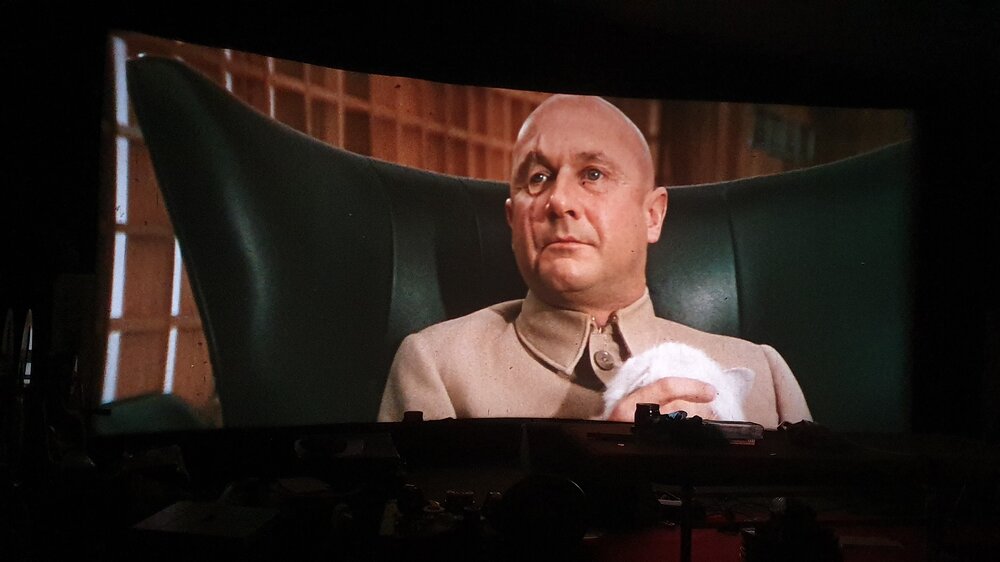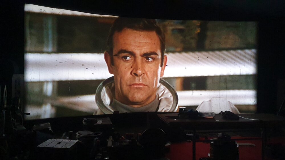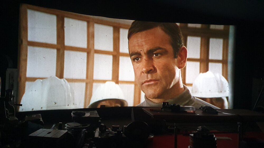 007 Man lebt nur zweimal Technicolor Kopie in Cinemascope und deutscher Fassung. Die Kopie ist grundsätzlich ok. Es gibt allerdings ein paar Stellen, die stärkere Gebrauchsspuren haben wie Klebestellen mit Versatz. Perforation gut, Kopie sofort spielbar. Kein Essig. 6 Akte in Weissblechdosen, keine Originalallongen. Euro 300.00 inkl Versand. Szene und Fotos vom projzierten Film: