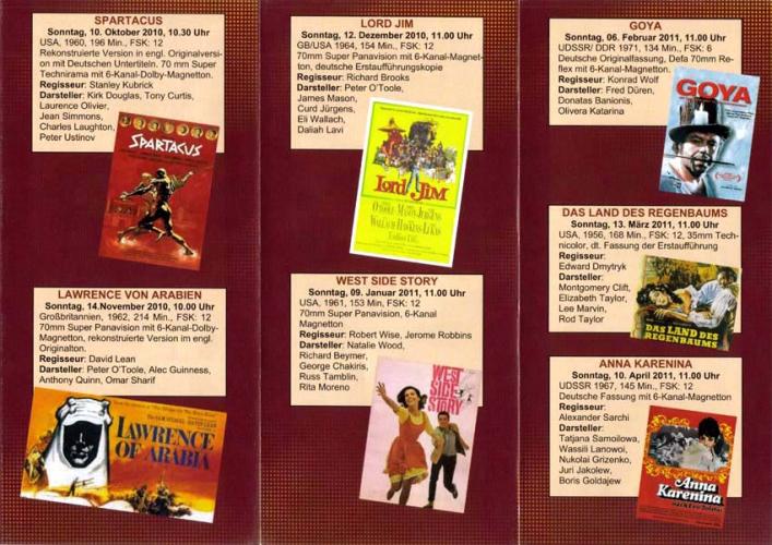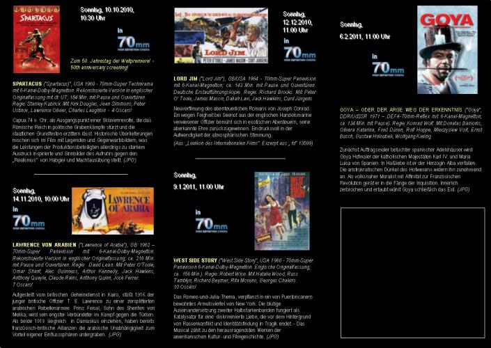 9. Der Hausflyer für die berliner 70mm-Saison ist fertig - und in Verteilung. Das Trailering ist ebenfalls angelaufen: es läuft ein echter Technicolor-Trailer von Technirama-Matrizen. Kommenden Sonntag um 10.30 Uhr - in herbstlicher Frühe - geht es los. Wer noch sehr müde ist, kann die Filmpause zum Schlummern nutzen. Für den 7.10.2010 ist noch eine kleine Reminiszenz im Forum angedacht.