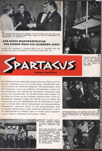 8. Dann ein herzliches Willkommen für alle, die schon im Morgengrauen aufbrechen. (Bei mir etwas später, weil quasi "um die Ecke" wohnend ... aber vielleicht liege ich noch länger, weil die Grippe nicht weggeht.) Heute vor 50 Jahren, am 7.10.1960, fand im New Yorker DeMille-Theater die Weltpremiere von SPARTACUS (Bryna Production) statt: oder auch in der Nacht zum 7. Oktober - das wäre dann bereits der 6.10.1960. Leider war unter uns hier keiner dabei, aber es gibt zumindest Zeitzeugen der deutschen Premieren in Düsseldorf ("Kristall Palast") und in Berlin ("Titania-Palast"). Die Kritiken waren überaus gemischt. Gerade die New York Times wagte sich an einen Verriss (http://www.nytimes.com/glogin?URI=http://movies.nytimes.com/movie/review&OQ=_rQ3D3Q26resQ3D9A06E3DE1738EF32A25754C0A9669D946191D6CF&OP=219f42b6Q2FQ3BQ60erQ3BB,rQ3B222Q3BqriQ51Q3BeEQ60ratra!Q3BiQ60hPamQ3BEahPa2Q22eqeQ3BiQ60hPaQ3BEahPa2 ), und das zeigt aus heutiger Sicht die seinerzeitige Skepsis gegen einen von Kirk Douglas produzierten Freiheitskämpfer-Film, nachdem man die Grausamkeiten und Rohheiten von THE VIKINGS (1959) gerade eben erst genossen hatte. Douglas wurde für sein Vorhaben belächelt und fand zeitweise kein Studio, das er zu einer Verfilmung überreden konnte: trotz des glänzenden Erfolgs von THE VIKINGS. Heute werden die Rankings anders bewertet, und im Moment hat er - trotz inflationärer Fernsehausstrahlungen - einen sehr respektablen Ruf: * Platz 81 in der 2007 erschienenen Liste der 100 besten Filme aller Zeiten. (1998: noch nicht berücksichtigt) * Platz 62 in der Liste der 100 Besten Thriller aller Zeiten * Die von Kirk Douglas verkörperte Rolle des Spartacus erreichte Rang 22 in der Liste der 50 größten Kinohelden aller Zeiten. * Platz 44 in der Liste der 100 am meisten inspirierenden Filme * Platz 5 in der Liste der 10 größten Leinwandepen aller Zeiten. Aus: http://de.wikipedia.org/wiki/Spartacus_%281960%29 Die Vorführung am Sonntag im 'astor' in Berlin wird in frisch eingemssenem Dolby-Magnetton abgehalten - die Kurven am Terzanalyzer zeigten sich nahezu "schnurgrade" (mal im Marketing-Timbre geschwärmt). Am Bild arbeiten wir noch, und es bieten sich da verschiedene Varianten mit ihrem Für und Wider (d.h., es gäbe neben den beiden 70mm-Grundformaten noch zwei weitere Formate, die angedacht sind).