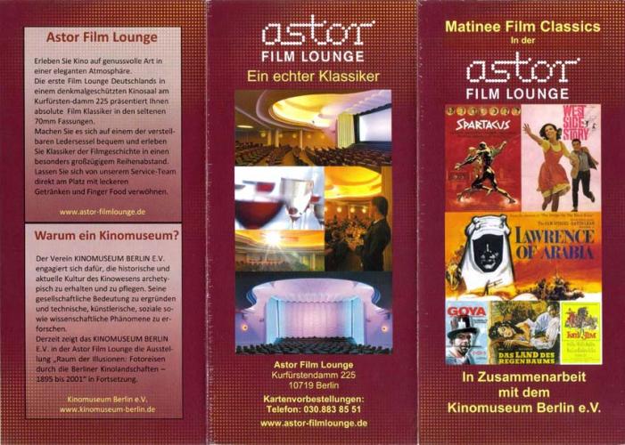 1. Neben der 70mm-Matinee-Reihe im Kino 'astor Filmlounge' hatte der Verein Kinomuseum Berlin e.V. auch eine Fotoausstellung zur Berliner Filmtheatergeschichte (in Fortsetzungen) konzipiert. Sie stiess wider das Erwarten auf sehr breiten Zuspruch und ist unentgeldlich zu besichtigen.