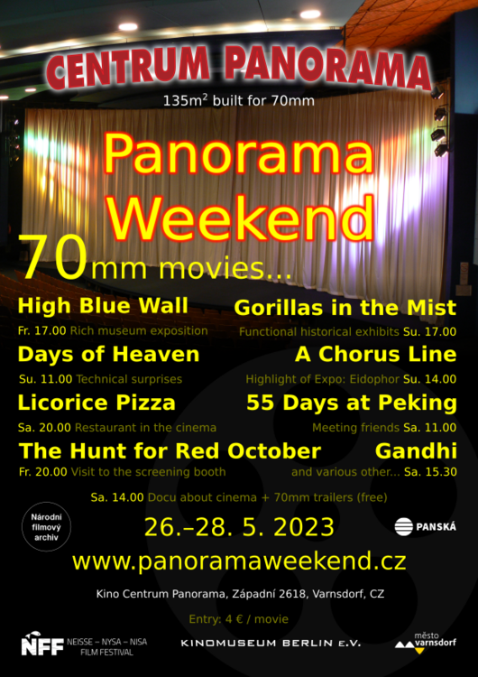 Das Centrum Panorama in Varnsdorf hat soeben um Weiterverbreitung und Unterstützung seiner aktuellen Annonce gebeten. Sie sei anbeigefügt. (Eine bestimmte, überregionale Förderung kam in diesem Jahr nicht zustande: jene Instanz erwartet offenbar ausverkaufte Event-Säle - Ha, ha, ha... Nichtsdestotrotz sind nun 8 Filme gesichert am Start, flankiert mit der Note, dass es dieses Jahr keine Wiederholungen gibt, jedoch einige technische Innovationen in der Ausstellung [Eidophor aus Berlin] und drumherum!) Weitere Fragen stets gerne an die Kinoadresse: 70mm[at]Centrum Panorama.cz http://www.centrumpanorama.cz/cz/program.html Weitere Bekanntgaben auch auf https://in70mm.com/now_showing/index.htm https://m.facebook.com/966765526733665/