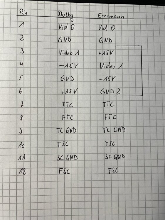 Hallo zusammen, ich versuche gerade, meine E15 mit einem DA20 zu verbinden. Leider fängt der DA20 allerdings wild an zu blinken, sobald ich das Reader-Kabel eingesteckt habe. Ich habe das Reader-Kabel direkt an der Dolby-Kamera angeschlossen. Vorgesehen war wohl, das es ein Kabel zwischen Kamera und Mainboard der E15 gab. Dieses war jedoch schon bei Übernahme der Maschine nicht vorhanden und der Digitalton damals funktionstüchtig. Das damals verwendete Kabel ist leider verloren gegangen. Beim Verdrahten ist mir aufgefallen, dass es gewisse Abweichungen in der Verdrahtung zwischen der DA20-Anleitung und den E15 Papieren gibt (Pin 3-6). Hat hier jemand Erfahrungswerte oder sind die unterschiedlichen Dolby-Reader tatsächlich unterschiedlich verdrahtet? Schon mal vielen Dank für eure Hilfe.
