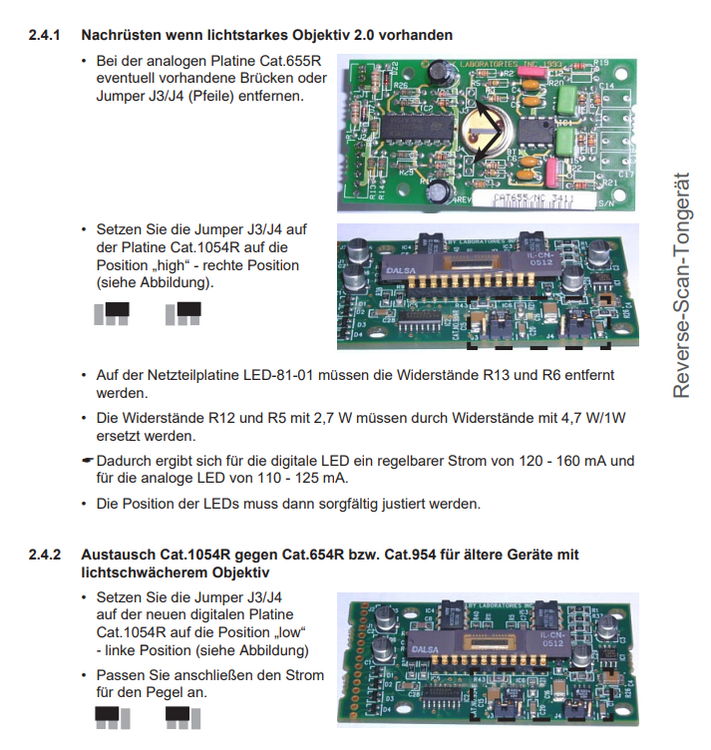 ...nur falls jemand noch einmal auf dieses Problem trifft: Wir haben gestern das Kabel noch einmal auf die Dolbybelegung umgestrickt, allerdings mit negativem Ergebnis. Anschließend wurde die Kamera zerlegt und es zeigte sich, dass zwei smd-Widerstände ziemlich gegrillt aussahen. Also: Kamera defekt. Ein zufällig herumliegendes Reverse-Scan-TG von Kinoton brachte uns auf die Idee, beide Kameras zu vergleichen. Ergebnis: Sie sind identisch und gegeneinander austauschbar. Lediglich das Kameragehäuse muss ein wenig angepasst werden, da die Molex-Steckerleiste anders eingebaut ist. Somit gilt bei der E15 (Kombitongerät) die Pinbelegung, die im DA20-Handbuch von Dolby genannt wird. Vielen Dank an @Cameo für tolle Unterstützung.