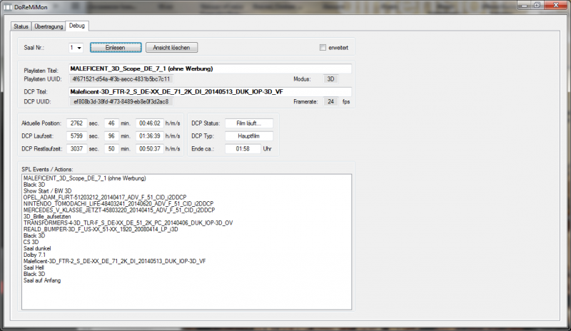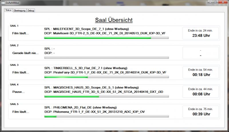 Der Mini Webserver auf dem Doremi ist für die DCP Untertitel gedacht. Die werden dem jeweiligem Projektor per HTTP also einem WebServer zur verfügung gestellt. Ob und wann die Websteuerung für die normalen Doremi Modelle kommt weiß ich nicht. Der Code zeigt aber das auch die DCP2K Modelle bei der Entwicklung berücksichtigt wurden. Interessant ist das Doremi extra dafür einen neue Schnittstelle eingeführt hat. Sie nutzen also nicht Ihne eigene KLV basierende cryptische API sonder einem morderne SOAP Schnittstelle. So, ab hier können dann auch wieder "nicht Techniker/Entwickler" wieder weiter lesen :-) Wegen den vielen Anfragen hier nochmal ein kurzer Status bzw. eine kleine Erklärung was ich vor habe. Es handelt sich um ein eigenständiges Windows Tool das regelmäßig (alle 15-60 Sekunden) den Status aller Doremis abfragt und schön aufbereitet. Diese Info stelle ich momentan zusätlich per Webseite zur verfügung. Damit kann dann auch an beliebigen PCs,Tablets, Smartphone im Kino den Status anschauen. Auf Wunsch von mkes habe ich auch noch eine individuelle Saal Webseite eingebaut. Damit kann sich dann jeder eine einfache DigitalSignage Lösung aufbauen. Das bedeutet das man sich einen Bildschirm/TV vor den Saal hängen kann den anzeigt was gerade darin läuft. Die Saalübersicht könnte man eventuell noch im Foyer anzeigen. Die ersten Screenshots die ich hier gepostet habe sind schon wieder veraltet :-) Ich habe mittlerweile auch die Poster Anzeige und den Upload von Postern integriert. Am meisten Probleme macht mit momentan die interne Logik zur Hauptfilm erkennung und die Anzeige eines ordentlichen Filmtitels für die Besucher. Der Haupfilm kann leider nicht am Kürzel "FTR" im DCP Namen oder dem ContentKind im DCP zuverlässig erkannt werden. Ich musste leider immer wieder feststellen das der gelieferte Content sich nicht immer an die Regeln hält und es dadurch zu einer falschen Anzeige kommt. Eine weitere Methode ist auf ein Makro zu warten das den Hauptfilm kennzeichnet. z.B. das Typische "Saal dunkel" vor dem Hauptfilm. Den Filmtitel möchte ich gerne auf zwei Arten realisieren. Einmal wäre da die zuweisung im Tool. Also der DCP Name "TF4_FTR_3D_71...." bekommt dann den Namen "Tansformers 4 3D" zugewiesen. Eine weitere schöne Methode fände ich den Filmnamen in die Playliste zu schreiben. z.B. innerhalb von # Zeichen (#Tansformers 4 3D#). Dann müsste man nichts mehr im Tool einpfelegen. Wenn das Tool nur für den internen gebrauch benutzt wird sollten Namen und Poster eigentlich egal sein. Was denkt Ihr ? Da momentan mein Urlaub vor der Tür steht und ich bis dahin leider nur wenig Freizeit habe wird es noch ein paar Wochen dauern bis ich die erste Version veröffentlichen werden. Es haben sich aber schon ein paar Betattester gemeldet :-) Ich werde hier im Forum bescheid sagen wenn es los gehen kann.