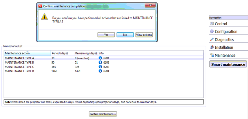 Dazu gibt es schon einen Thread. Bitte benutz die Suchfunktion :-) (ach wie schön, das wollte ich schon immer mal schreiben) Einfach im Communicator das Maintenance Tab öffnen und dort auf Smart Maintenance klicken. Dann die gewünscht Wartung makieren und bestätigen. Steht auch im Handbuch ab Seite 195 Wartungsintervalle sind: A Wartung alle 30 Tage Alle Filter reinigen, Anschlüssen und Linse auf Staub überprüfen. B Wartung alle 90 Tage Lüftungsöffnungen reinigen, Kühlmittelstand überprüfen C Wartung alle 1 Jahre Staub im Projektor, Software Update, Elektrische Anschlüsse, kompletter Kühlkreislauf, Lens holder, Dolby Rad. D Wartung alle 4 Jahre Austausch der Kühlmittelpumpe (ja wirklich), check aller Lüfter -