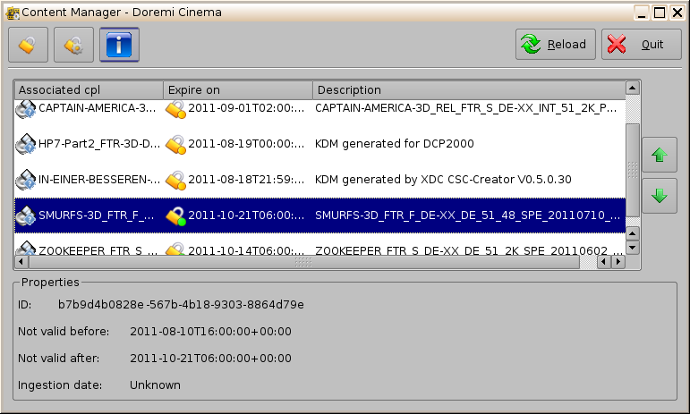 Seit gestern Abend gibt es nun endlich die offiziell Software Version 2.2.2 für die Doremi Server DCP-2000 & DCP-2K4. Ich habe es mal ausprobiert und wollte Euch hier ein paar von den unzähligen Neuerungen vorstellen. Alle Neuerungen und Fehlerbehebungen im Detail findet man im neuen Handbuch bzw. in den Doremi Release Notes. Wie verläuft das Update ? - Update Datei "dcp2000_patch-2.2.2-0.pkg" auf einen USB Stick - Im Doremi wie jeder andere Content Ingesten - Reboot, Fertig Also alles relativ unkompliziert. und los gehts....... CineLister hat jetzt eine schöne Suchen und Filter Funktion bekommen. Einfach nur ein bestimmten Typ anzeigen lassen oder einfach selbst einen Suchfilter setzten. Systemmeldungen werde jetzt immer im Systemtray Bereich angezeigt. Bei neuen Meldungen erscheint ein Popup. Innerhalb der Meldungen kann man direkt zu dem Problem springen. Das Control Panel mit neuen Funktionen Im Operator Log können wichtige Dinge von Hand mit eigenen Komentaren in das Doremi Log geschrieben werden. z.B. eine Festplatte war kaputt und wurde durch Firma X vom Techniker Y getauscht. Oder alle Luftfilter wurden von Kollege Müller gewechselt. Somit kann man später alle Arbeiten am System nachvollziehen. Macht aber bestimmt keiner... :unsure: Device Controller um Projektoren mit IMB anzumelden. Es gibt jetzt endlich eine Audio Configuration. Hier können jetzt endlich nach belieben die AES Ausgänge umgeroutet werden. Auch ein Audio Delay kann direkt im Menu eingestellt werden. (früher ging das nur in einer Konfig Datei) Es gibt jetzt einen sehr schönen Content Manager mit einer Übersicht des Speichers. In den Untermenüs finden sich zahlreiche Infomationen zu Content, KDM´s und SPL´s. Auch das Exportieren von ShowPlayListen und Content auf externe Speichermedien ist jetzt möglich. (früher ging das nur von der Linux Konsole) Ja, da sieht man bei mir gerade nicht viel da ich größere Platten eingebaut haben und noch kein Content drauf ist. :rolleyes: Hier ein Beispiel wie die KDM´s dargestellt werden Auch in den Makros hat sich was getan. Es gibt jetzt eine Funktion um ShowPlayListen miteinander zu verknüpfen. Also ein Makro in dem man eine andere SPL starten kann. Vorgefertigte Steuerbefehle für MasterImage Server Shutdown ist jetzt auch endlich ein Option für all die Stromsparer die am Ende der SPL den Doremi runterfahren möchten. Es kann natürlich auch eine leere SPL nur mit dem Shutdown Makro erstellt werden. Diese kann dann per Zeitplan jeden Abend um X Uhr angefahren werde.