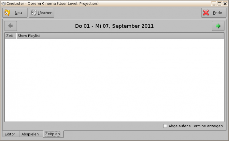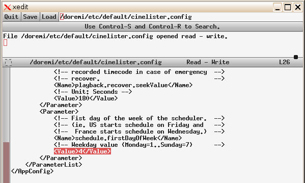 Naja, leider nicht ganz so einfach für normale "Benutzer" :D Ich versuch es mal zu erklären.... 1. Terminal starten und mit dem Befehl "su" zum Root Benutzer wechseln. (Root Passwort muss natürlich bekannt sein) 2. Folgende Befehl ausführen. Damit wird die Beispiel Konfigurationsdatei für den Cinelister aktiv. rwdo cp /doremi/etc/default/cinelister.config.sample /doremi/etc/default/cinelister.config 3. Mit dem folgenden Befehl die Konfigurationsdatei zum bearbeiten öffnen. rwdo xedit /doremi/etc/default/cinelister.config In der Konfigurationsdatei den Wochenanfang von 1 (Montag) auf 4 (Donnerstag) setzen und die Datei mit Save (eventuell 2x klicken) speichern. Reboot nicht nötig, der Cinelister muss nur geschlossen und neu geöffnet werden. :!: Übrigens, wenn Ihr schon in der Datei unterwegs seid dann kann man auch hier gleich die Sprung Zeiten für das vor und zurück spulen einstellen. Default ist 180 Sekunden. Das wären dann die bekannten 3 Minuten. Viel Spaß, und macht nix kaputt ! :rolleyes: Wenn alles richtig gemacht wurde sollte es so aussehen : Viel Spaß und macht nix kaputt ! :rolleyes: Replaced = ausgetauscht Wo steht das und wer sagt das ? Bei Problemen mit dem RAID melder der Doremi eigentlich ein "degraded".