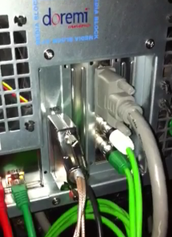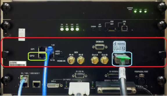 Also als "neueren Dolphin Boards" verstehe ich eigentlich die IMB´s (Integrated Media Block). Das ist praktisch das Dolphin Board als externe Variante im Projektor Slot. Angebunden wird das dann nichtmehr über SDI. Zwischen Doremi Server und Projektor IMB Board wird ein PCIe Kabel gesteckt. Und dieser IMB hat natürlich auch wieder 4 GPI´s und 8 GPO´s aber diesmal als RJ45 Stecker bekannt aus der Netzwerk Technik. Auch die AES Ausgänge werden über 2x RJ45 Stecker raus geführt. Die SDI Ports bleiben dann Frei, was ich ganz praktisch finde wenn man da mal nen Sat Empfänger oder ähnliches anschließen möchte. HDMI in gibt es auch noch, weiß aber gerade nicht ob der auch wirklich angesprochen werden kann. Hier nochmal ein Bild : Rot = IMB im Projektor (z.B. Barco) Blau = PCIe Stecker Grün = Automations Ausgang GPO