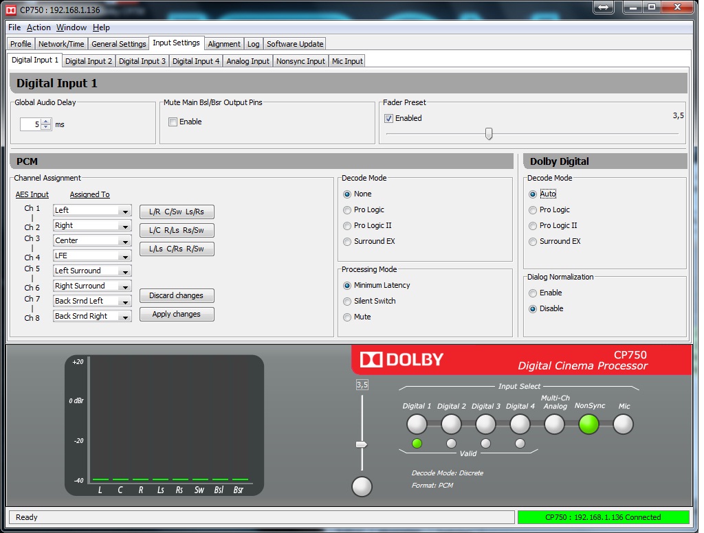 Hallo Christian, die System Software Version kann ich morgen nochmal in Erfahrung bringen. Setup Software ist 1.2.3.167304. Meine Formatumschaltung (5.1 / 7.1) mach ich jetzt über die ASCII Strings "cp750.sys.output_wiring_config bsl_bsr" und "cp750.sys.output_wiring_config none" bzw. unter den "General Settings" -> "Main Audio Output Configuration". Egal in welcher Kombination, die "Decode Mode" Einstellungen in "Digital Input 1" haben für mich keine nachvollziehbare Funktion. Wenn ich BsL/BsR einschalte, was ja eigentlich auch richtig sein sollte, bekomme ich mit dem Tron 7.1DS die normalen Surround Kanäle auf die Back Surround gespiegelt. Die eigentlichen Back Surround Kanälen bleiben dann aber stumm. Egal welchen "Decode Mode" ich auch auswähle. Ist auf jedenfall sehr komisch. Vielleicht wartet der CP750 auf irgend ein eingebundenes Signal was Disney nicht in die DCPs gepackt hat. Also im BsL/BsR Modus verhält der cp750 sich richtig wenn es um 5.1 geht. Wenn ich die Einstellung auf "Other (or none)" stelle werden alle 7.1 Kanäle wie erwartet sauber in den Saal gebracht. Bei 5.1 bleiben aber die Backsurround stumm. Auch hier haben alle "Decode Mode" Einstellungen keinen Einfluss auf das Verhalten. Ich hänge nochmal ein paar Screenshots an. -
