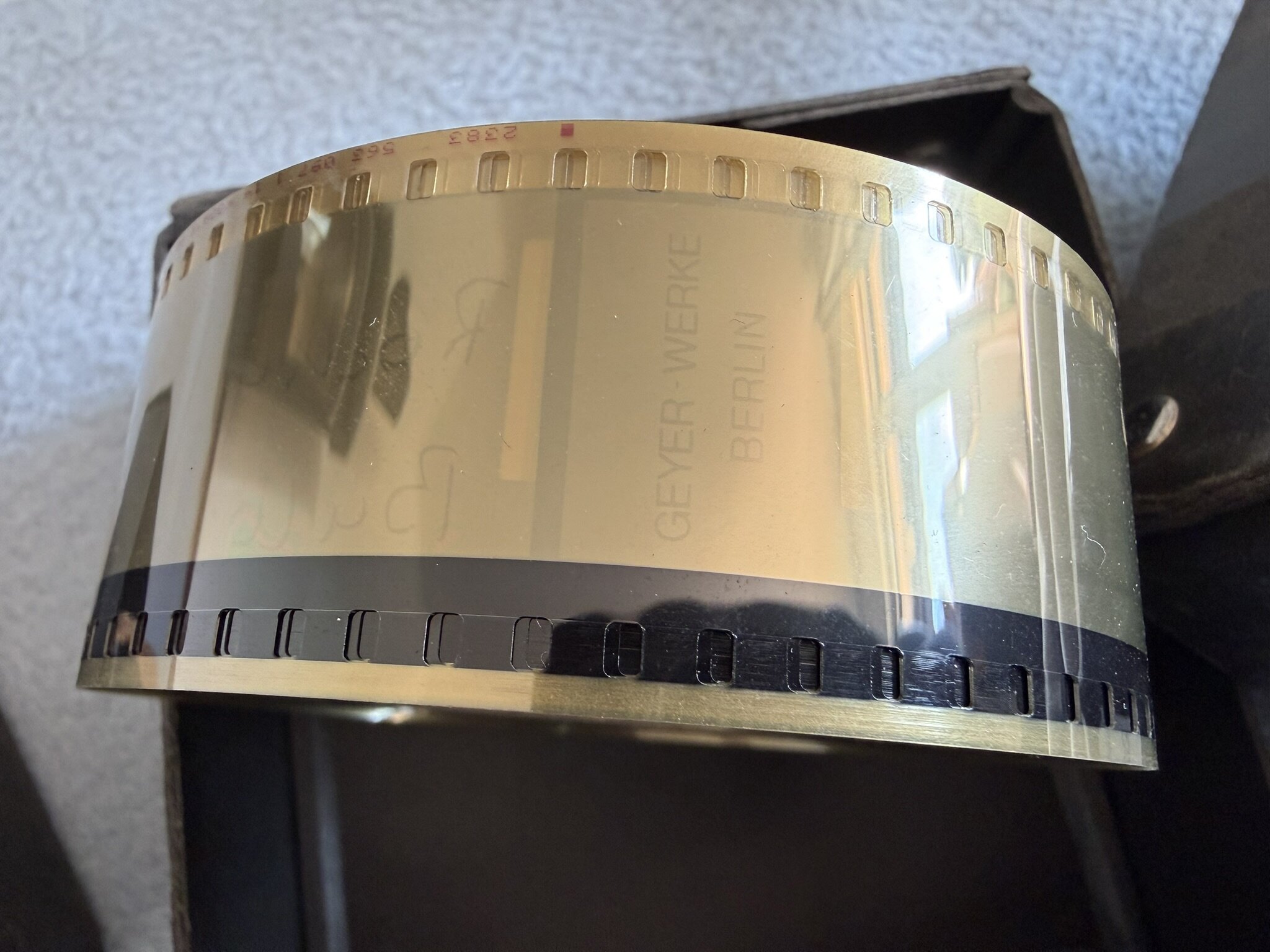 3. Schwarzfilm neu in Dose, Magnetband-Vorspann blau, zwei Rollen mit Filmresten (Umkehr) Komplett 10 Euro zzgl. Versand Privatverkauf ohne Rechte und kein Gewährleistung.