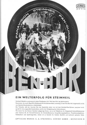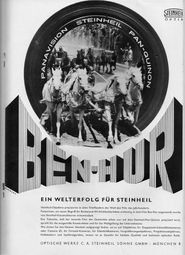 9. Beim Entrümpeln meines Archives bin auf diese Anzeige gestoßen. Als Nachwuchsvorführer war damals ich ganz erstaunt, als die mit der 70mm Kopie angekündigte Leihoptick zur Projektion der anamorphotischen 70er Kopie nicht von einen der üblichen Hersteller wie ISCO, MOELLER, ZEISS, FOX/SATEC oder TOTALSCOPE stammte, sondern von einem kleinen, mir damals unbekannten Hersteller in München. Bei meinen Recherchen entdeckte ich u.A. diese Anzeige im KINO-TECHNIK 1960. Es blieb der einzige Auftritt von Steinheil im Projektionsgeschäft. Ich denke, ein schönes Stück Nostalgie zum Ausdrücken. Klaus