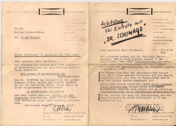 11. Beim Einsatz des ersten-und meines Wissens einzigen - 70mm Werbespots in der Adventszeit 1968 war der abgebildete technische Hinweis beigelegt. Bin sehr gespannt auf die sicherlich eingehenden Expertisen ! Übrigens hatte ich damals das Pech, dass der Spot 4 Wochen lief mit einem 35mm Hauptfilm. Die U2 für 1Minute und 32 Sekunden umzubauen erforderte im Überblenbetrieb schon eine große Liebe zum Metier. Klaus